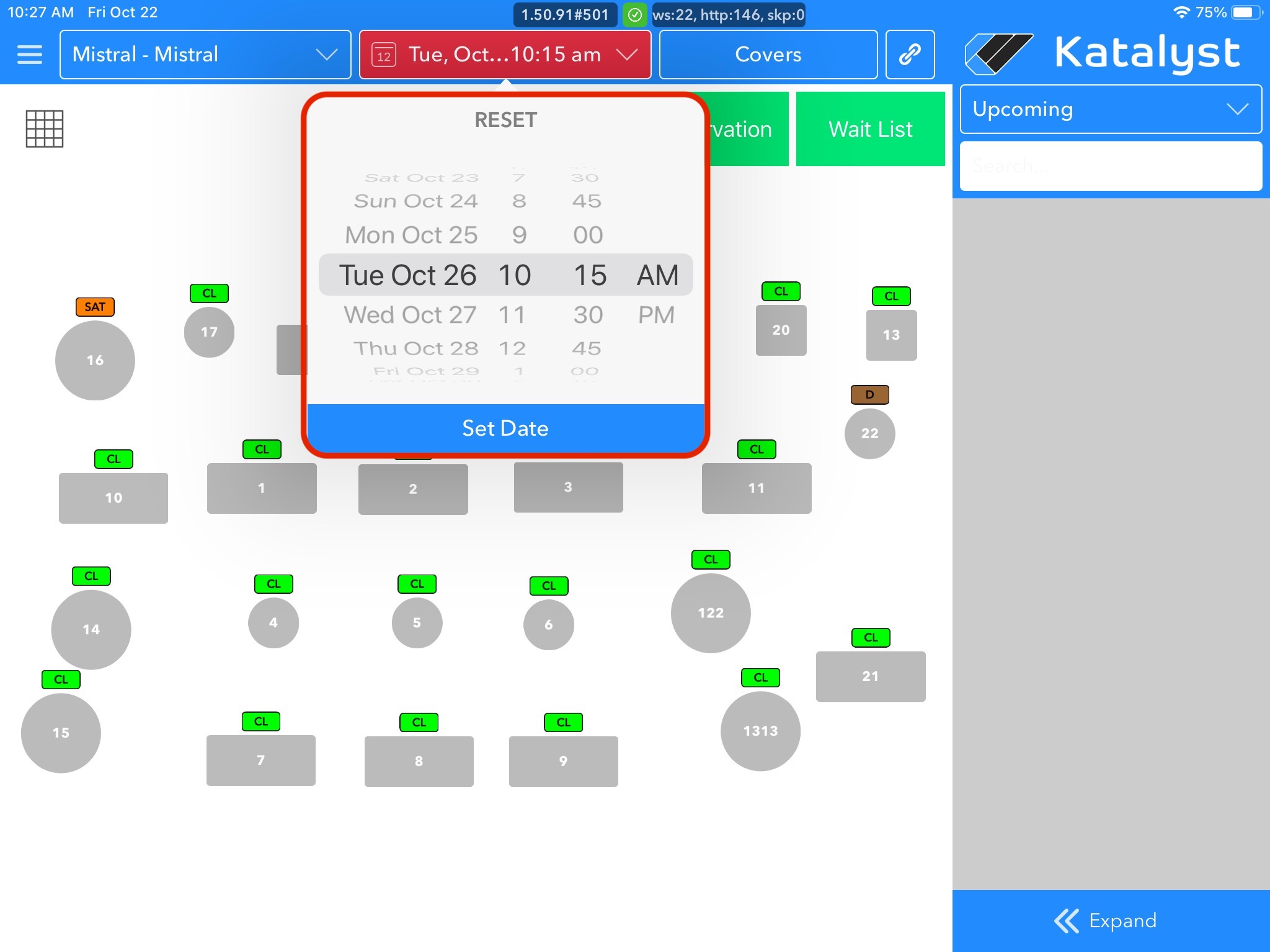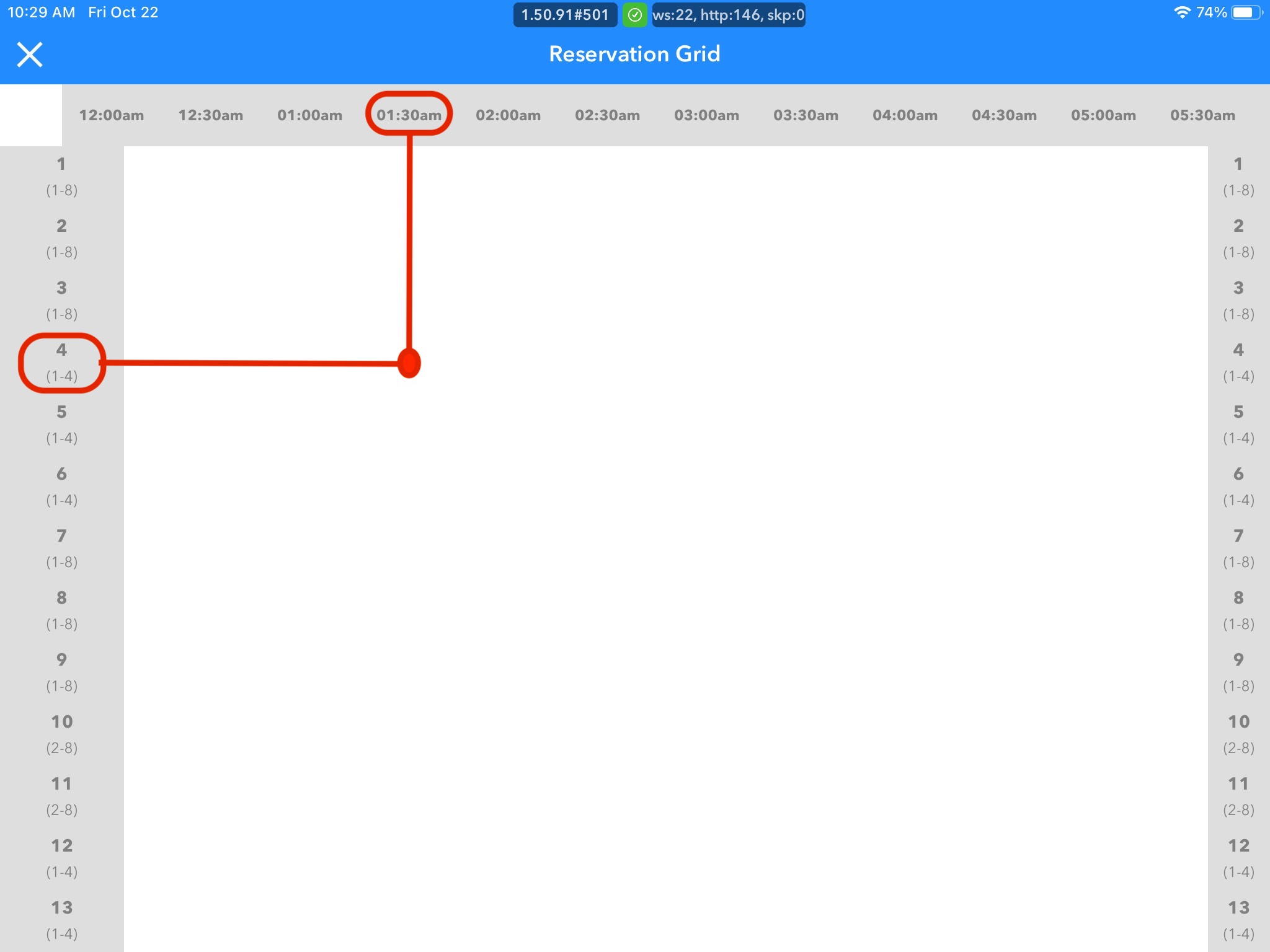 1. Select the correct date for the reservation you wish to create using the date picker on the floor-plan homepage, then tap the Grid icon in the top left.