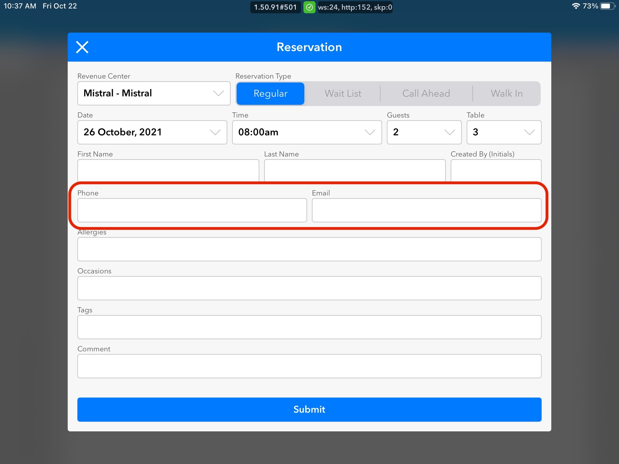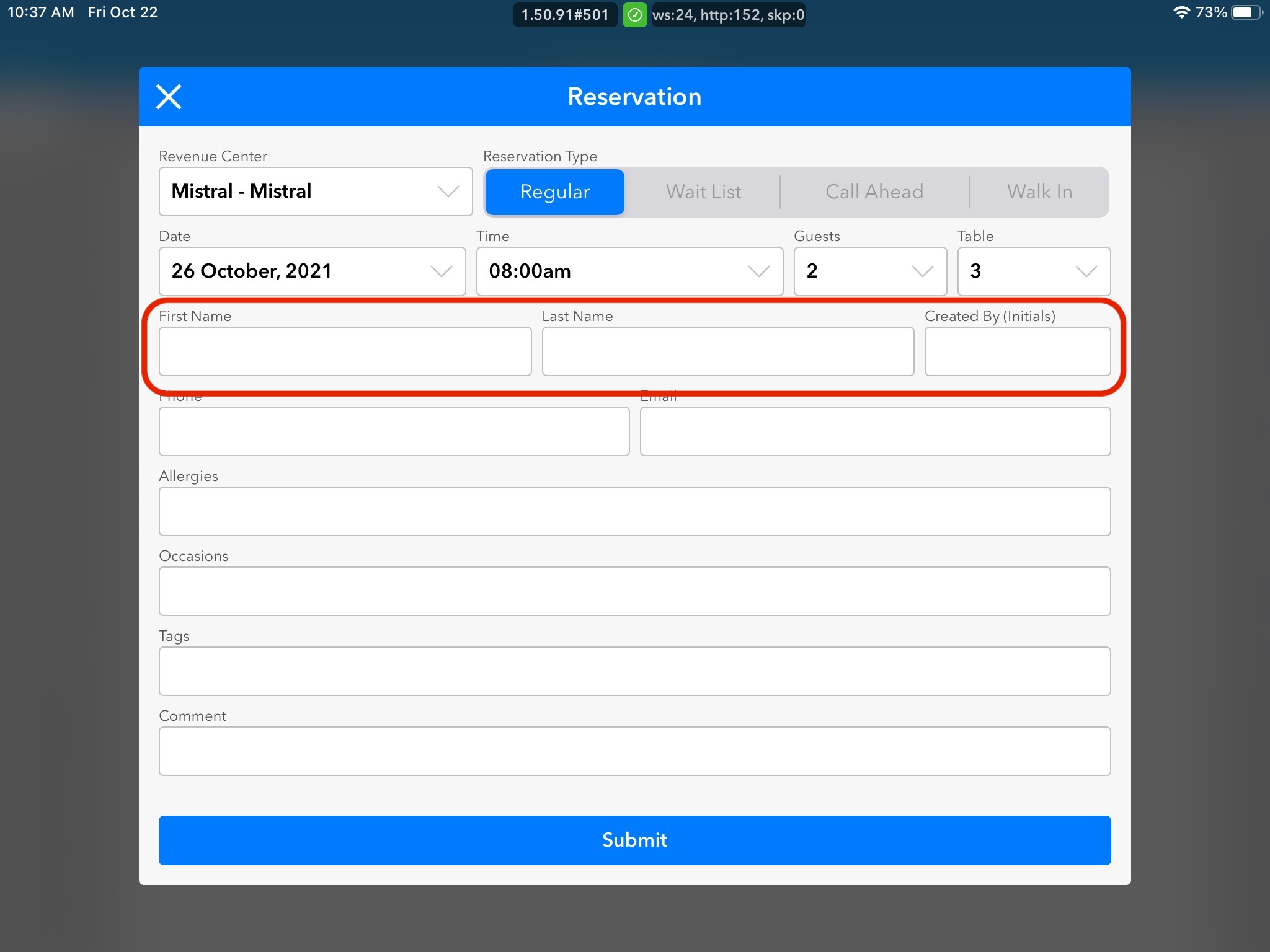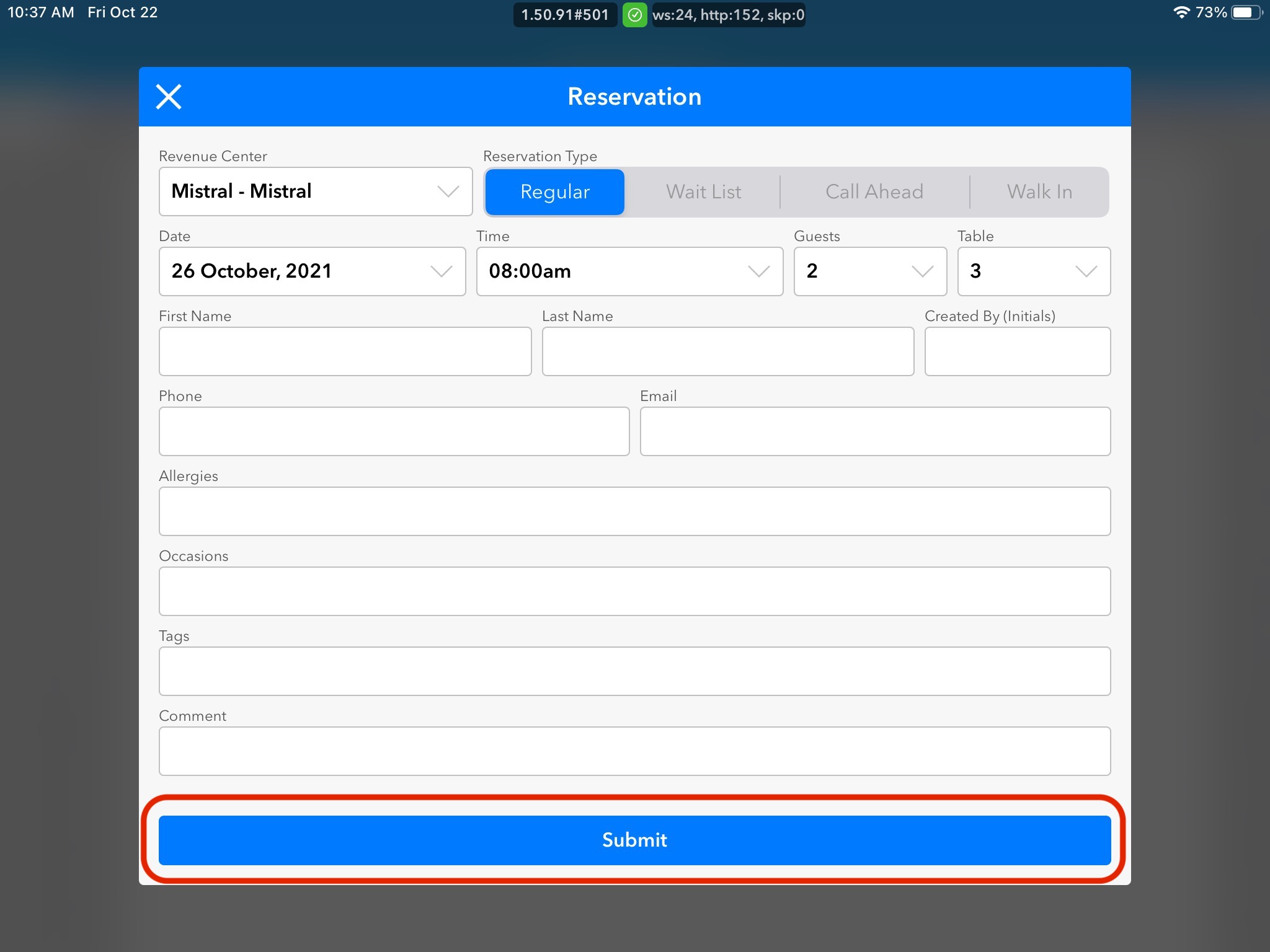 4. Table and Date & Time of Reservation will be automatically filled out based on the area of the grid you clicked to create the reservation. Make sure to double-check if the pre-populated information is correct.