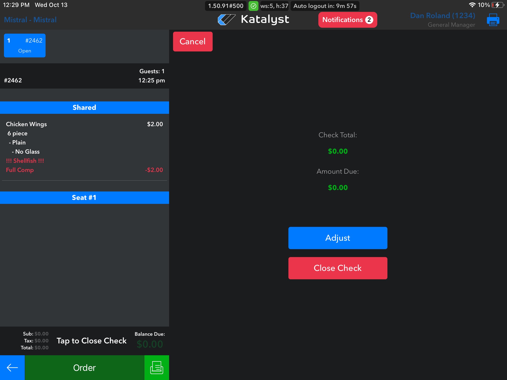 Once you tap on Tap to Close Check, a new screen will generate with the check total and the amount due listed. From here there are two options, to Adjust the check or Close the check. If we click to close the check, it will be closed. If we click Adjust, a new screen will appear.