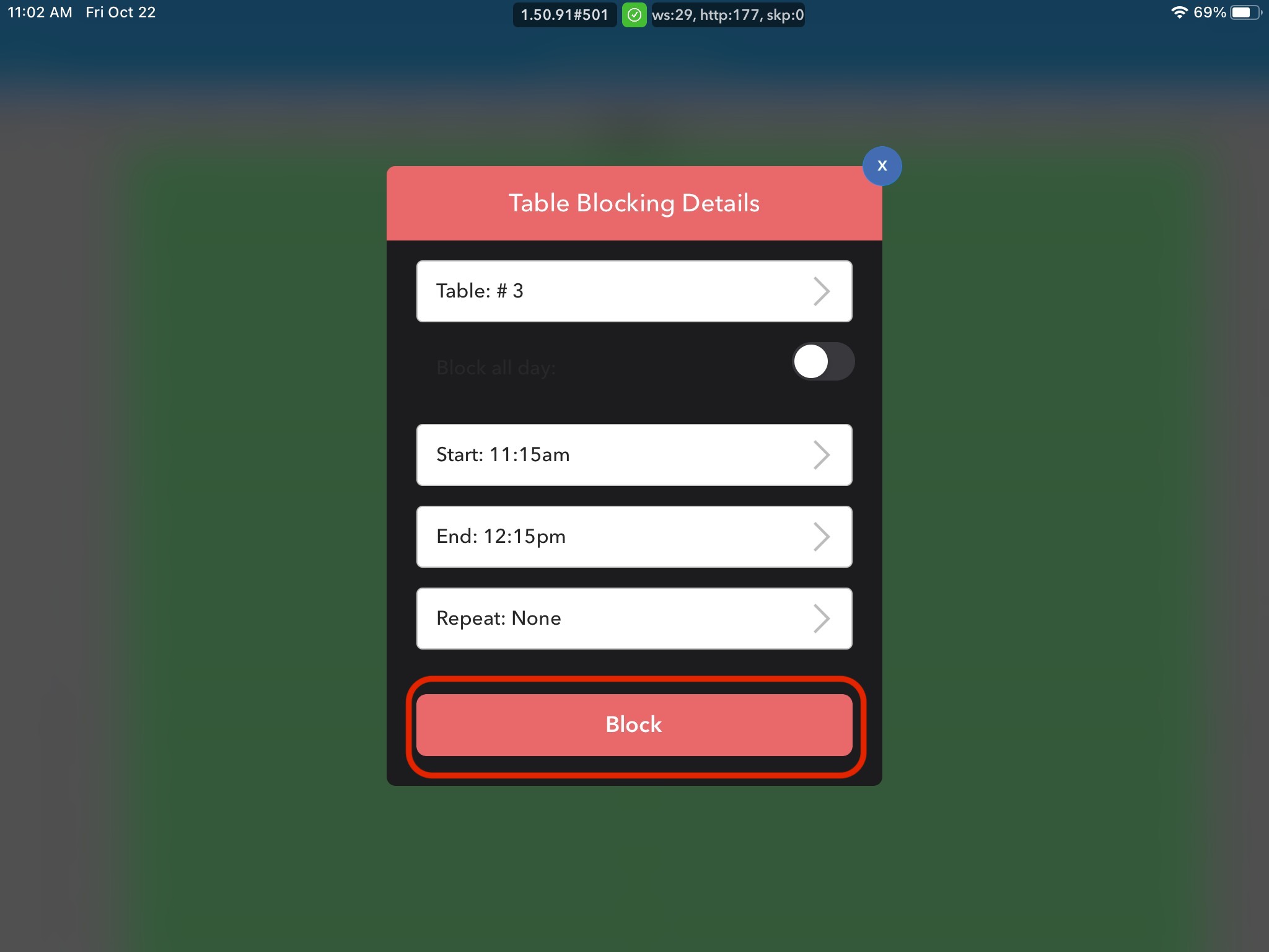 2. In the Grid, click on the selected table and corresponding time you wish to block a table for, then click Block Table in the new pop-up box.
