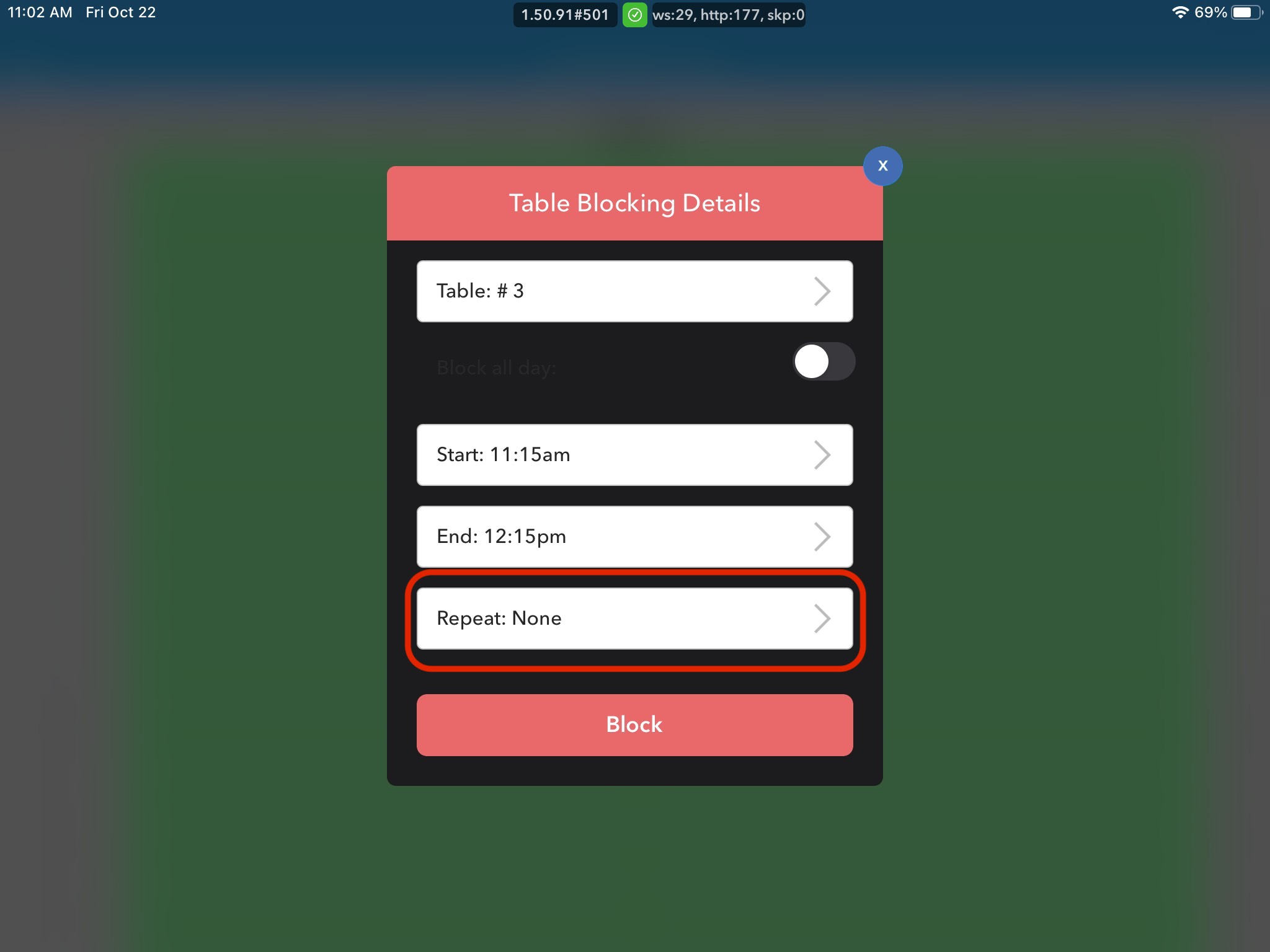 4. Select the frequency you want that table to be blocked. You can choose between: None, Daily, and Weekly. If you want to block a table just for that specific date, make sure Repeat: None is selected.