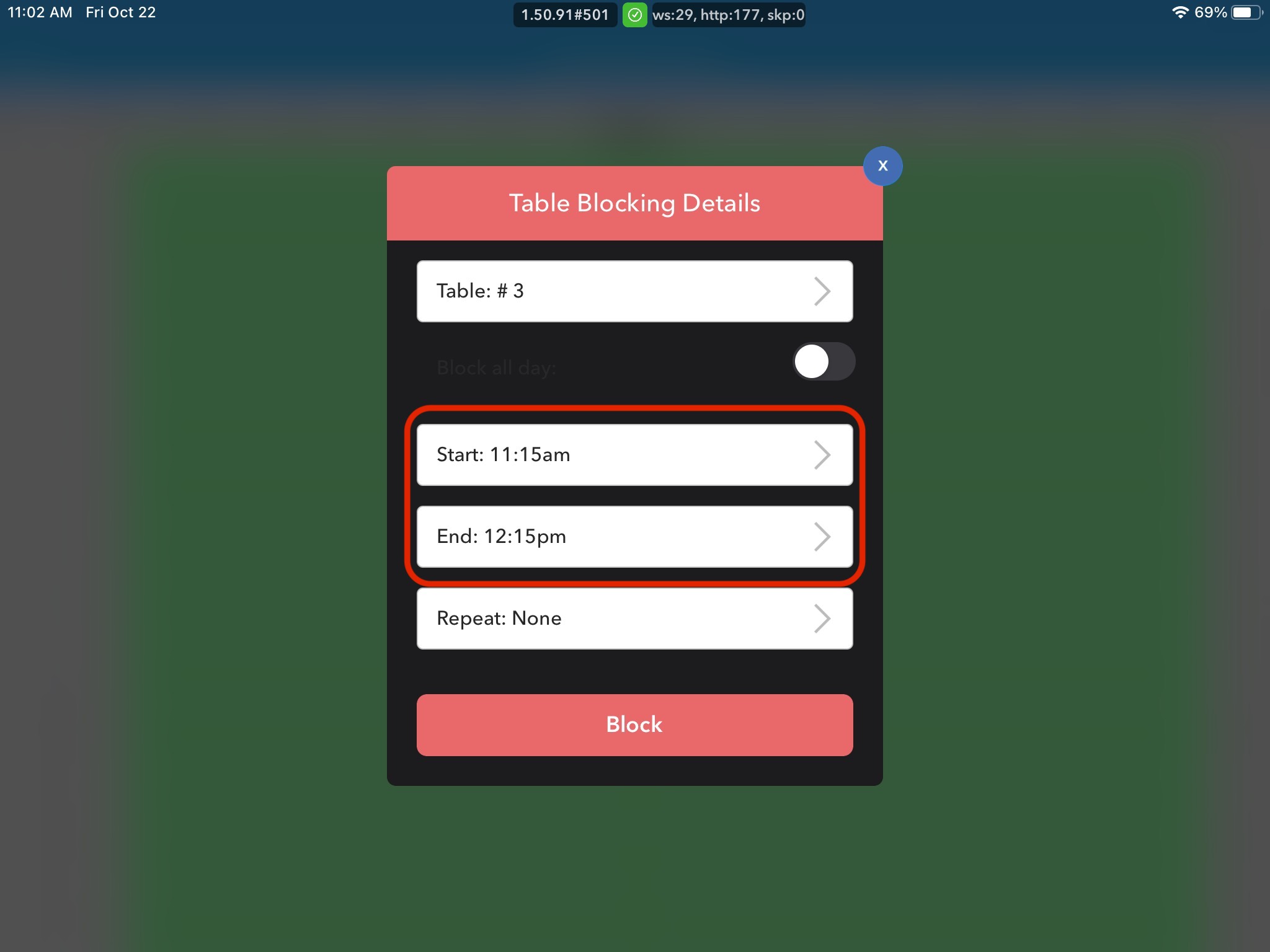 3. In the Table Blocking Details Box that will appear, select the Start and End times for table blocking. To block the table for the entire day, check the Block all-day box.
