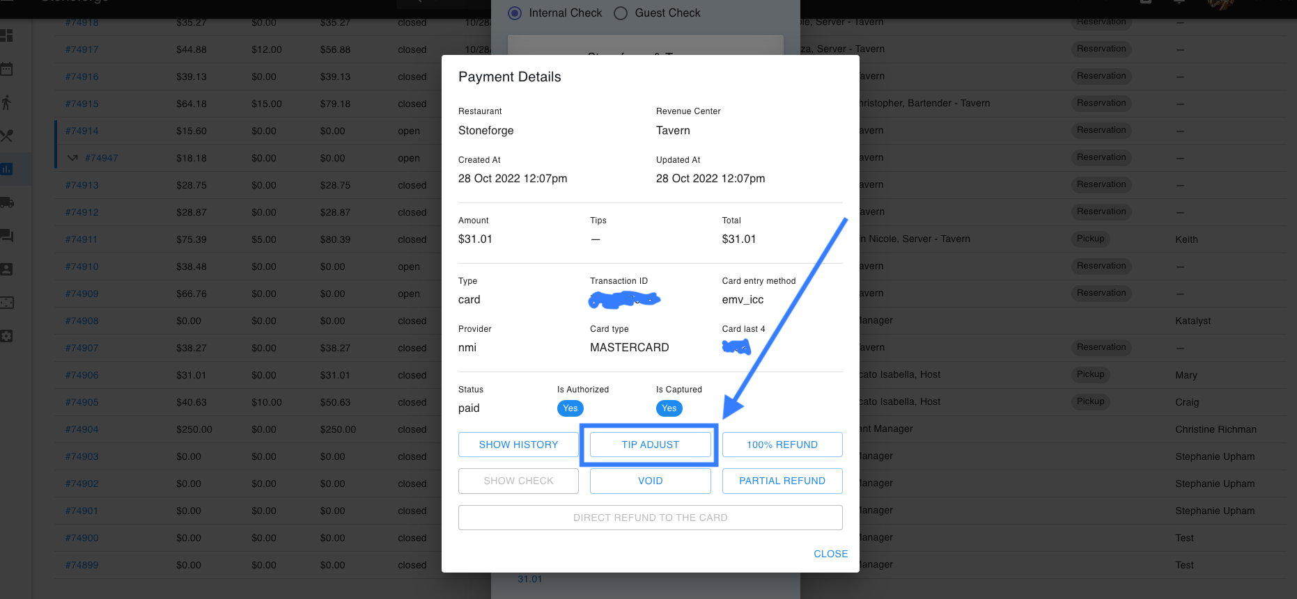 To access your checks again you will need to go the web side through your Admin Portal and go to Reports > Checks to search for your check number. Once you have located the check you would like to adjust, you will need to click into it. At the bottom of the pop-up that appears will be a clickable area that is labeled Payment Details. Click into this for a new pop-up where the tips can be adjusted by clicking into Tip Adjust.
