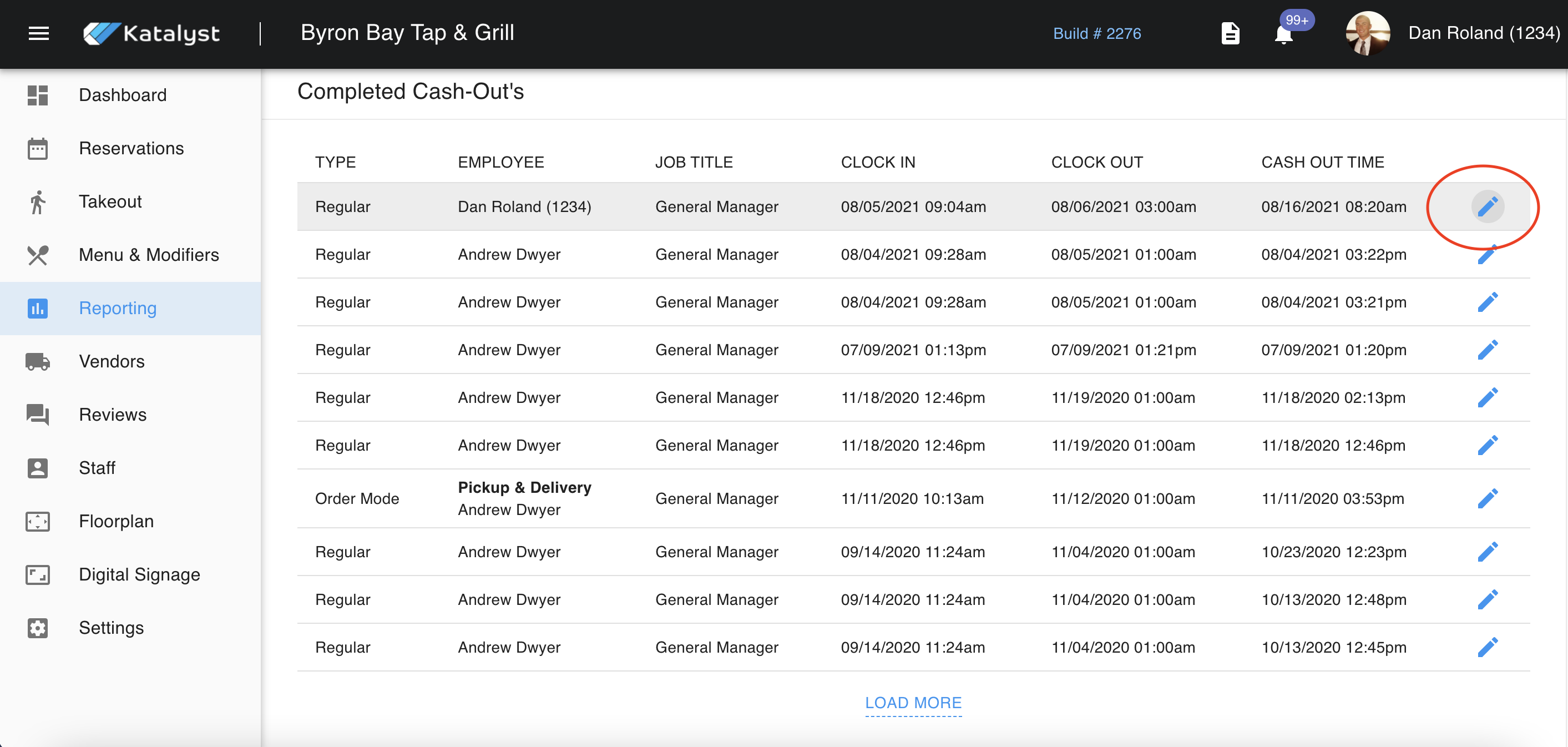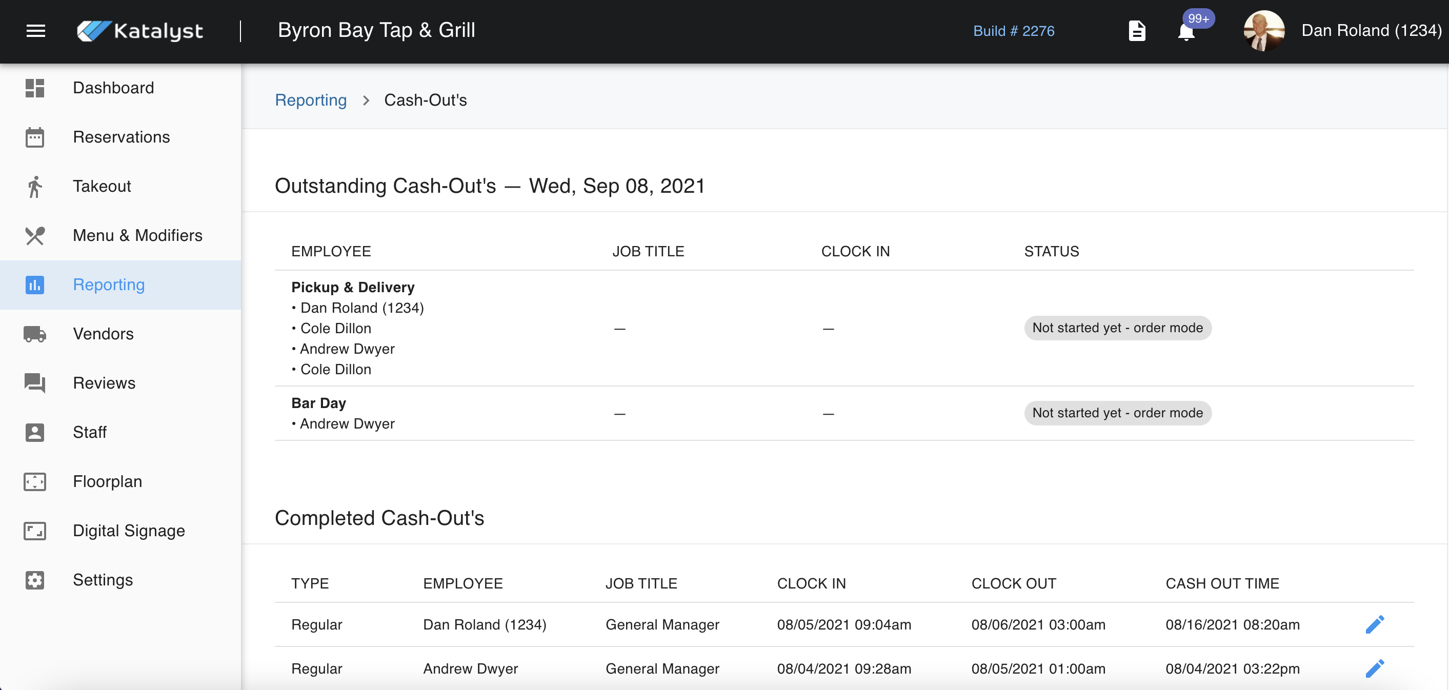 Below that will be where the completed cash-outs can be found. Completed cash-outs will show who cashed out, their title, clock in, clock out time, and cash-out time.