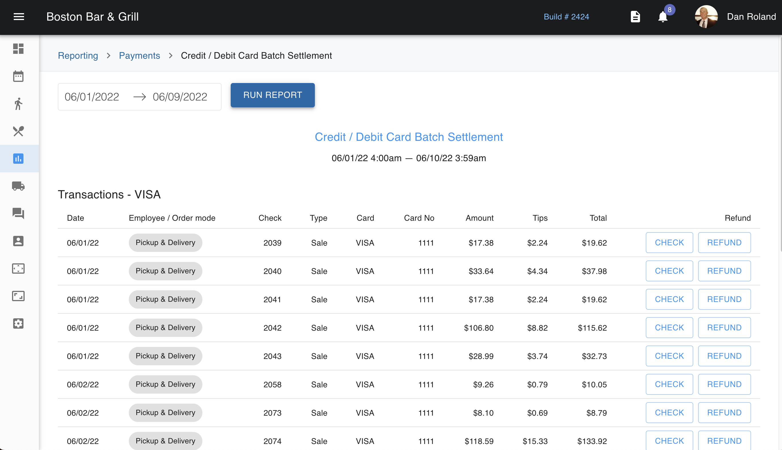 Under the Reporting tab in the Admin Portal, there is a section called 'payments' that houses multiple types of reports. One of these reports is the Credit/Debit Card Batch Settlement. You can go here and filter this report by date. Here, you can compare your batch numbers to those that the processor will send. From here, you can also pull the check much like you can from the check screen. The exception is, when viewing the check here, you will not see or be able to edit the check in the payment details. Instead, it will show you the customer's information. However, if you click on the refund option to the right, it will take you to the payment details screen which will allow for adjustments.