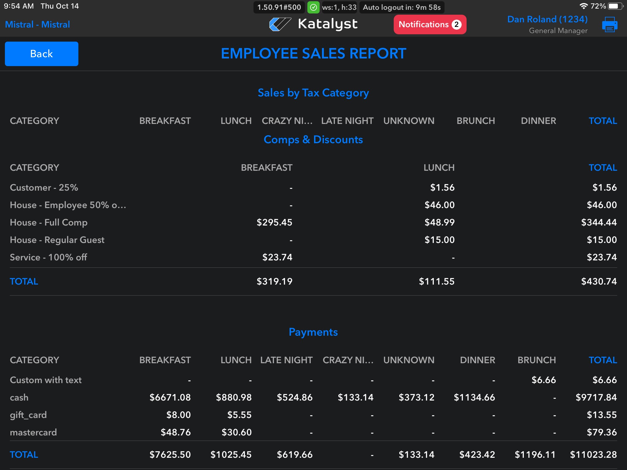 From here the merchant can view sales by category, tax category, comps & discounts, and payments. All reports are broken down by day part.