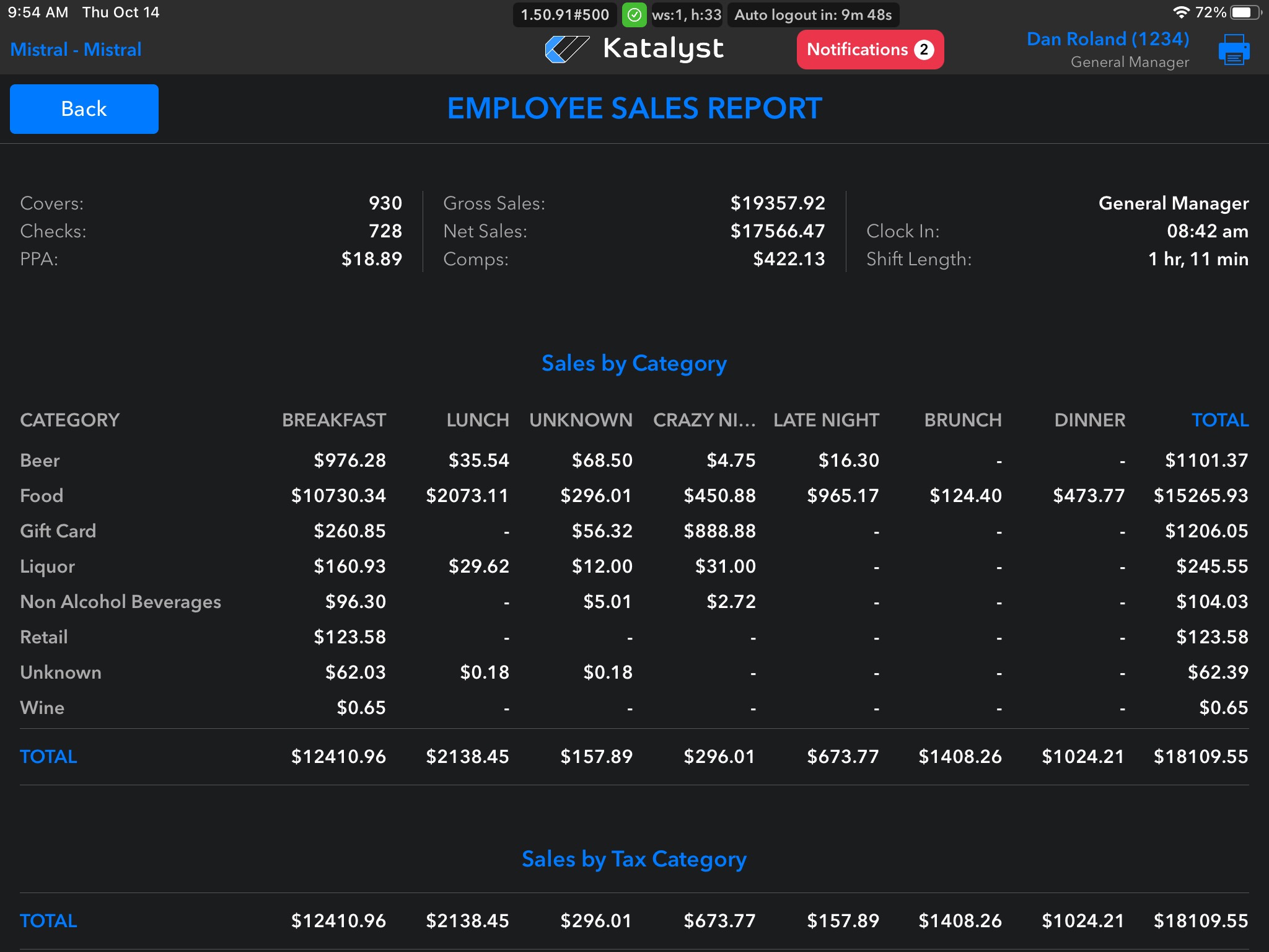 The Employee Sales Report is a great resource to see how employees are doing throughout the day. By clicking into this screen, we can see a quick reference at the top that allows us to see total covers, checks, PPA(per person average) gross sales, net sales, and comps within in our current selected day.