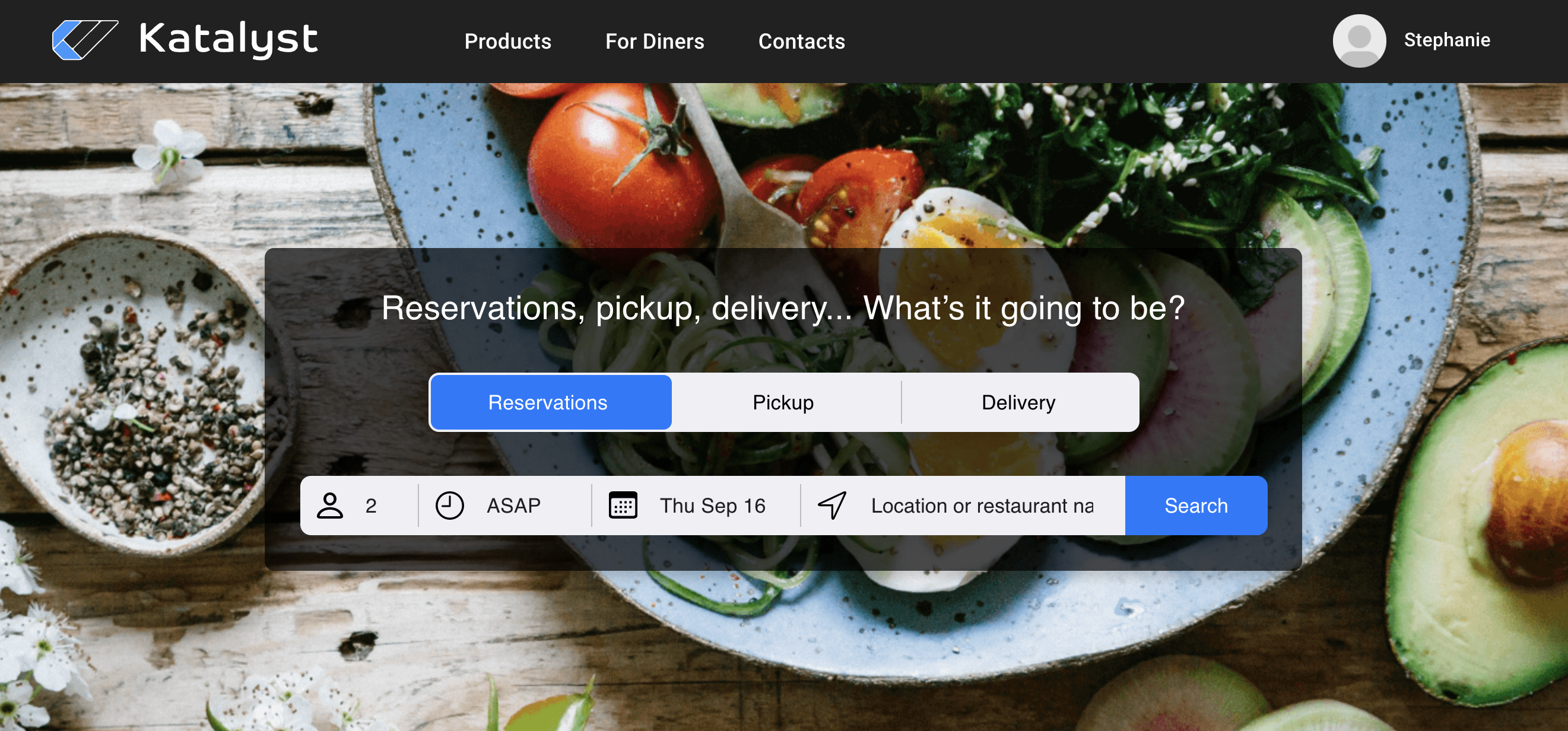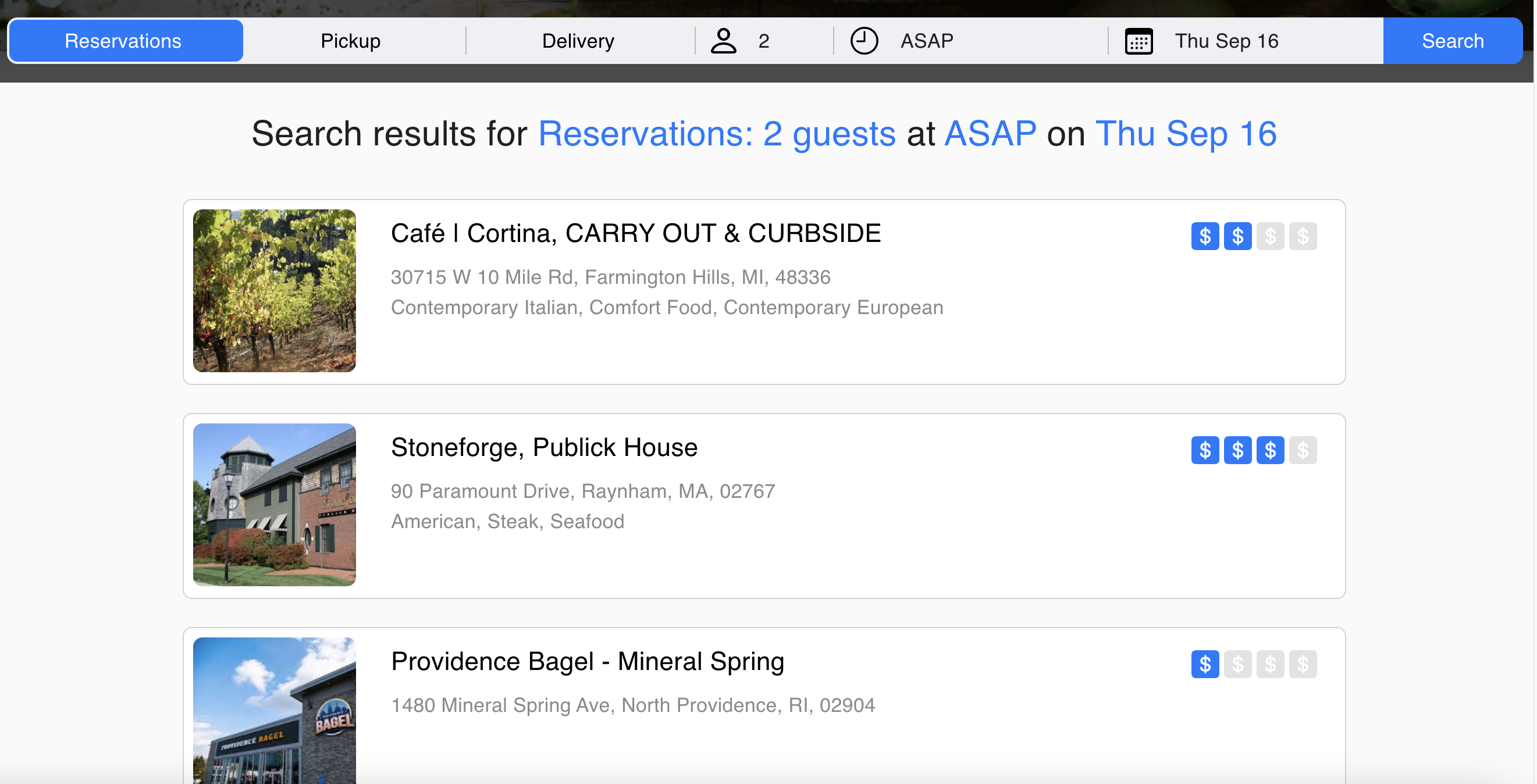 Once your customers are on the page below, they can select either reservation, pickup, or delivery. They may choose their headcount, when they would like to make a reservation, they may schedule a pick or delivery, and finally what area they would like to search.