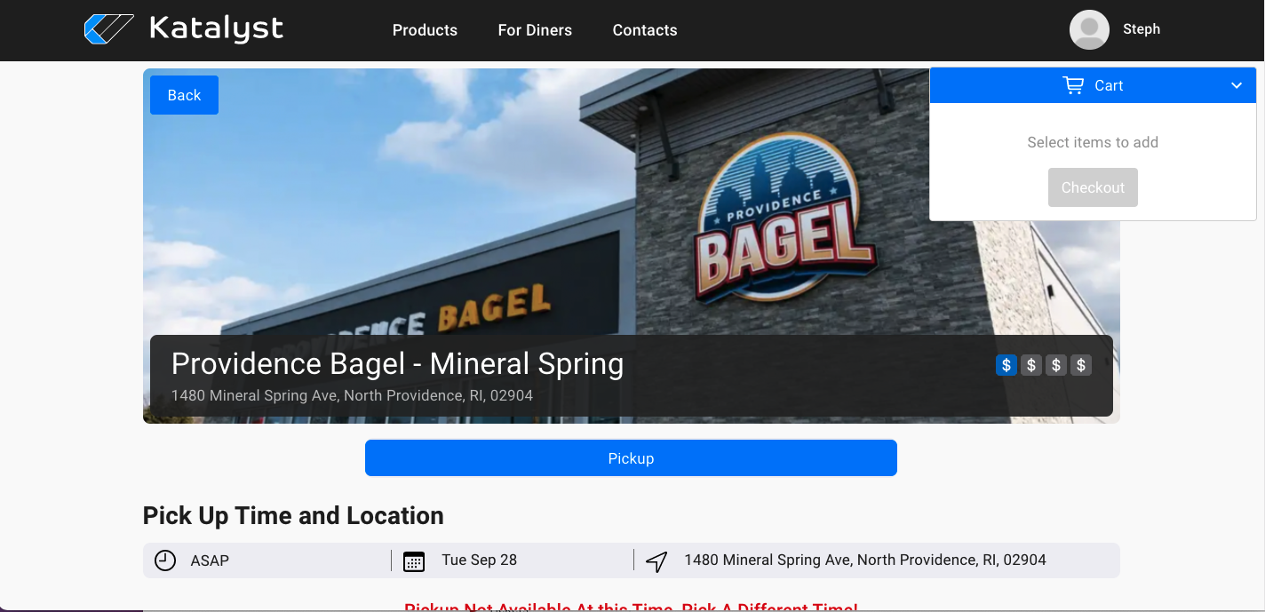 Once the customer is on the restaurant's page, they will see a header with a photo, as well as what the customer has set for time, date, and address. In the upper right-hand corner there will be the customer's cart which they can leave dropped down or by clicking on the down arrow to collapse the cart view.
