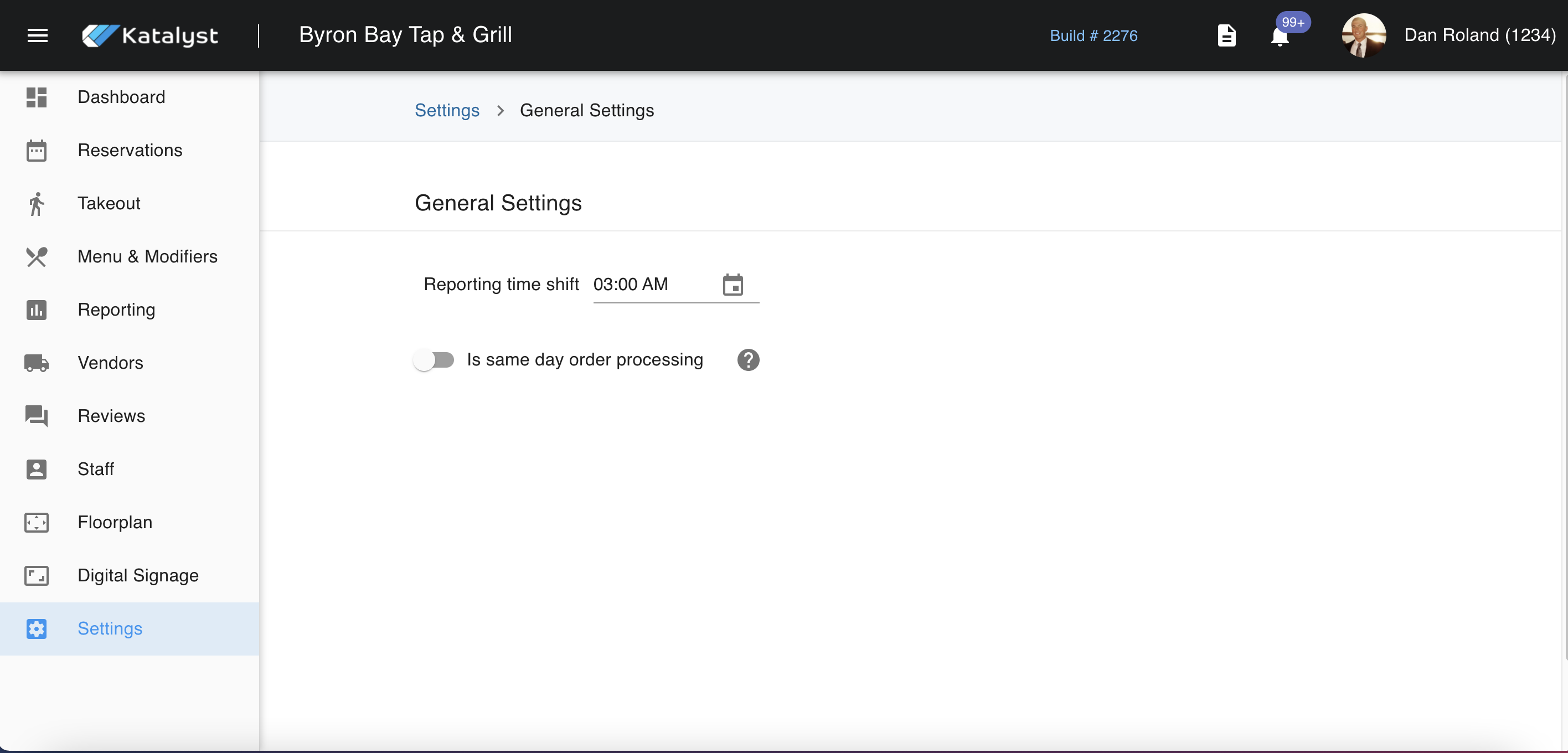 General settings is where the system will clock everyone out in case someone forgets. The toggle below the top setting is for online ordering. If the toggle is on, the system will clear out any online order that was made in advance should they be cleared out or not. If the toggle is off, the orders will stay in until they are cleared. You can hover over the question mark pop up for additional info.