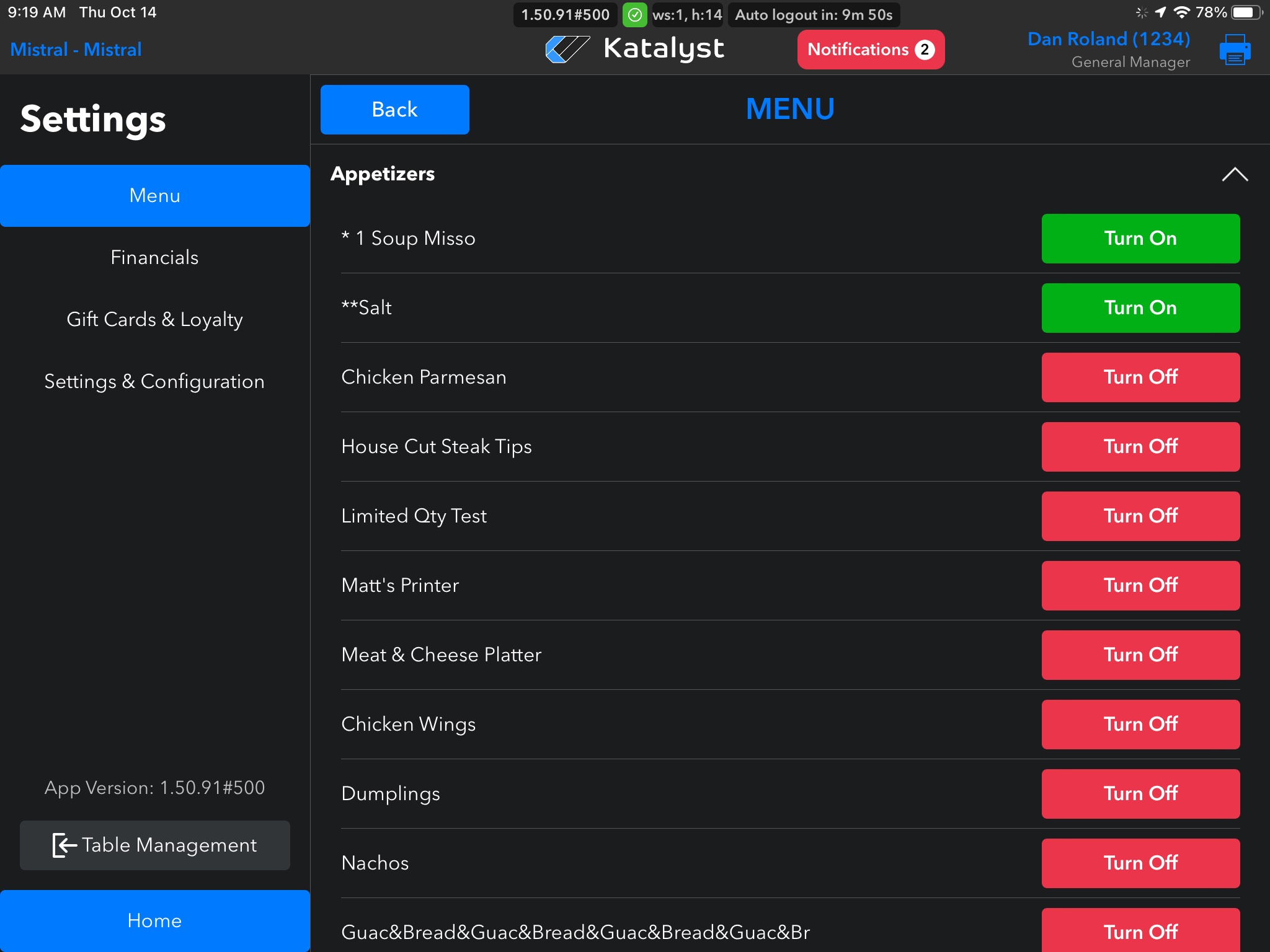 Clicking on a menu option will show all options under this menu modal. From here, you can 86 an item. This is a common restaurant term meaning that the restaurant has run out of an item. If this happens, the item should be turned off in the system so that staff can not continue to order the item. The staff just need to remember to go back in and turn the item back on should they get more.