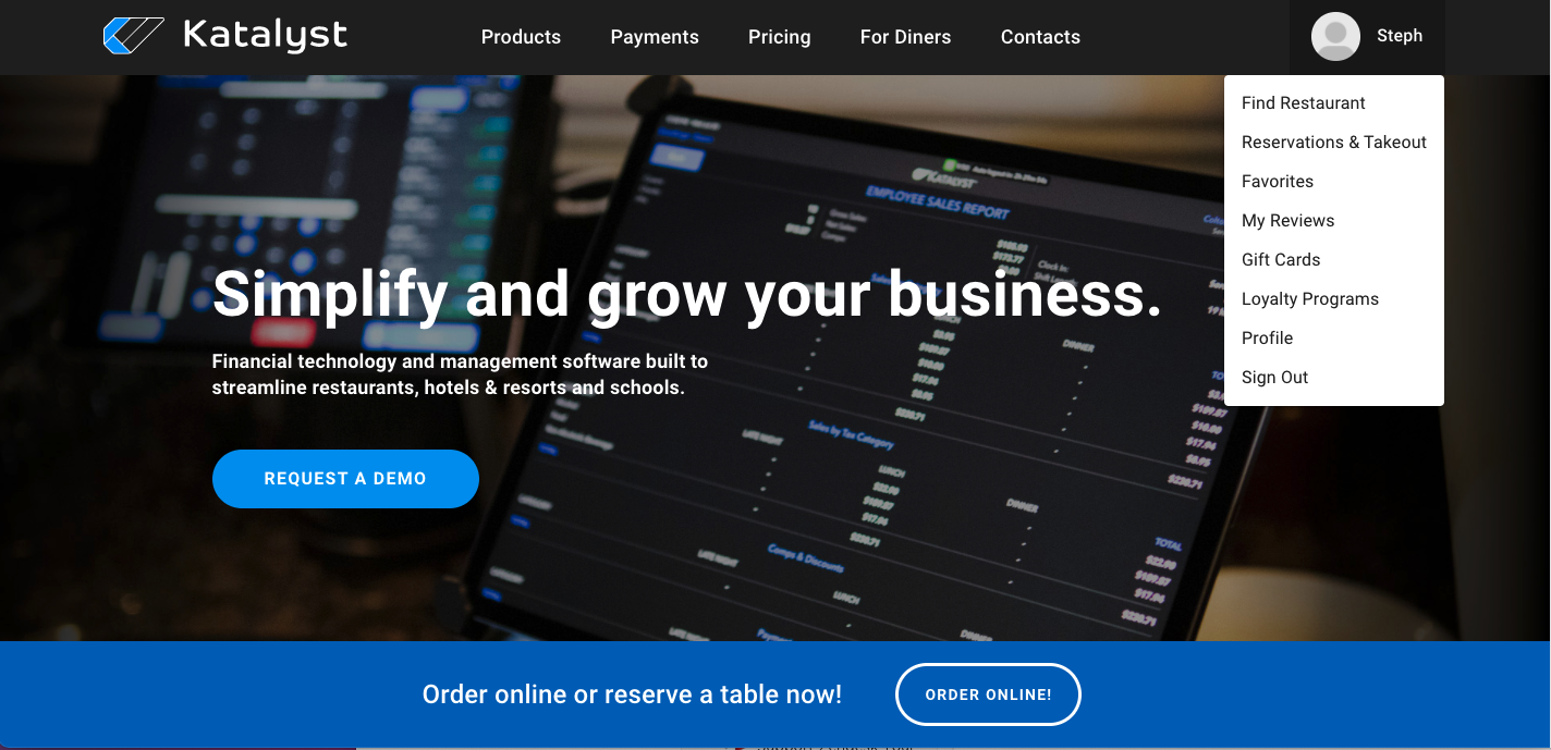 The customer can also navigate their profiles by clicking on their name. A drop-down will appear that will give them access to find a restaurant, make reservations, schedule a take-out, look at favorites, view their reviews, check gift cards, check loyalty programs, look at their overall profile, or sign out.