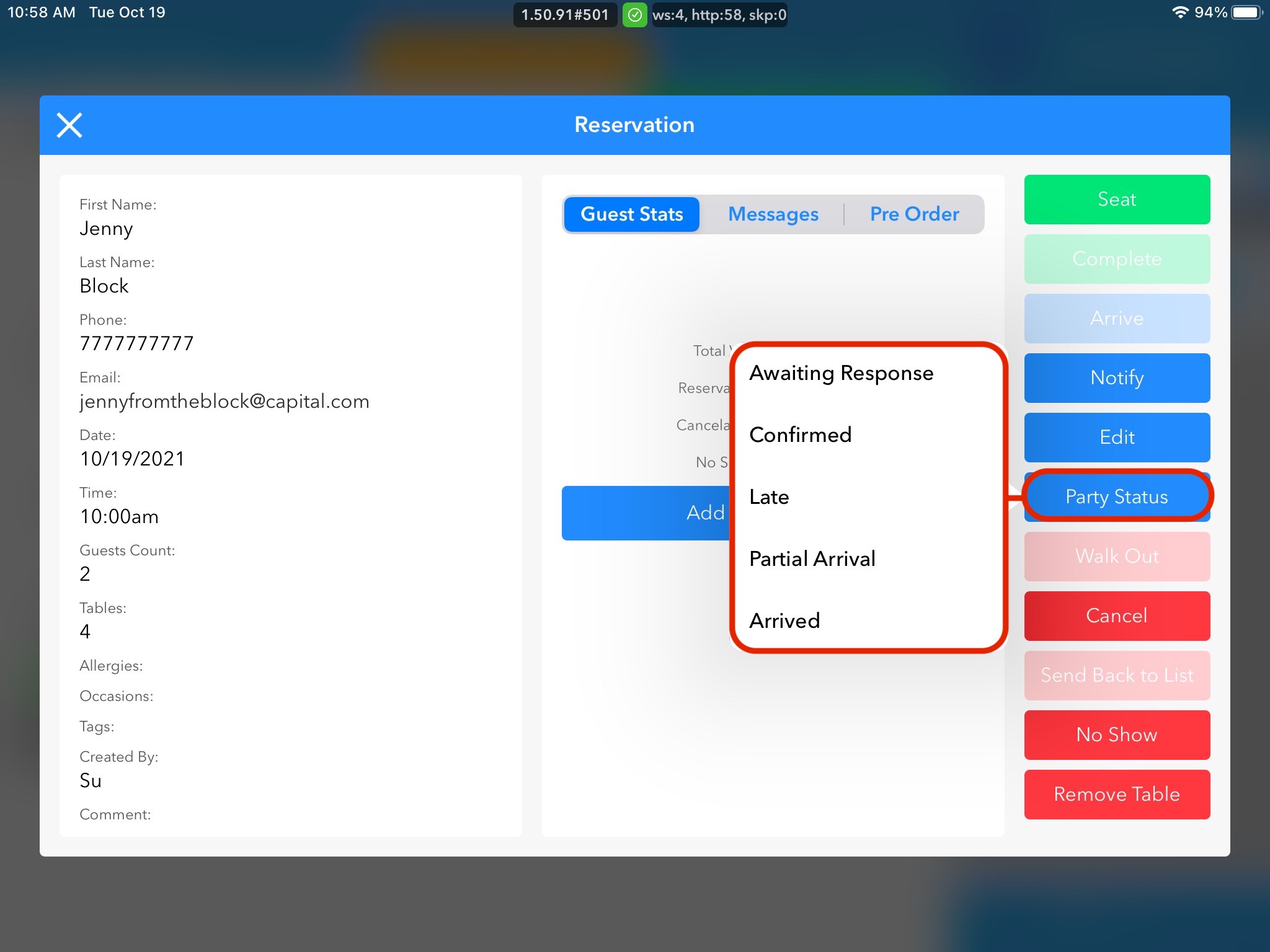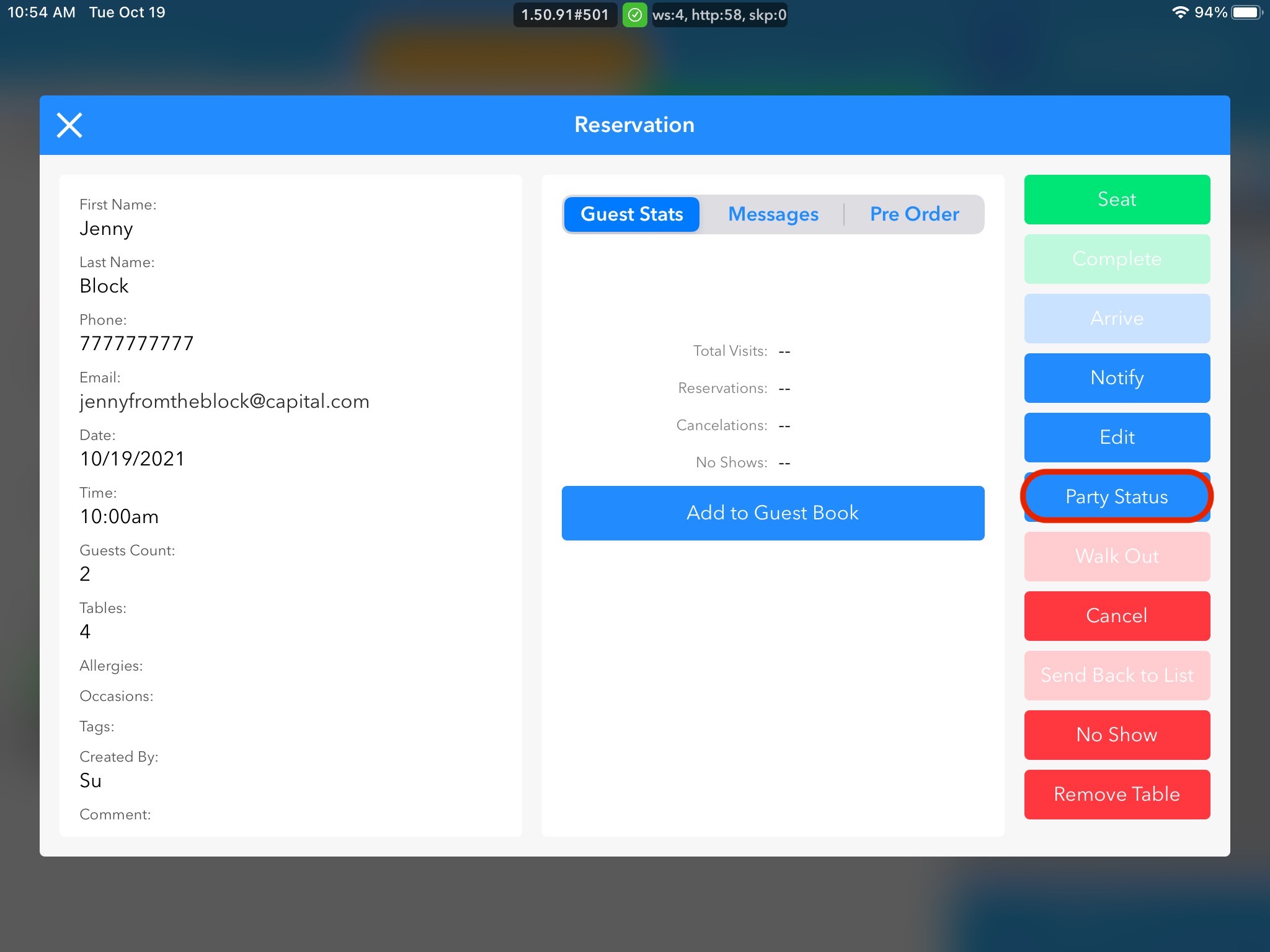 To the right of the guest, are stats where we are able to update the customer status. From here, to update their status, we will want to look at the blue button options which are arrive, notify, edit, and party status. For the purposes of this training block, we will click into party status.