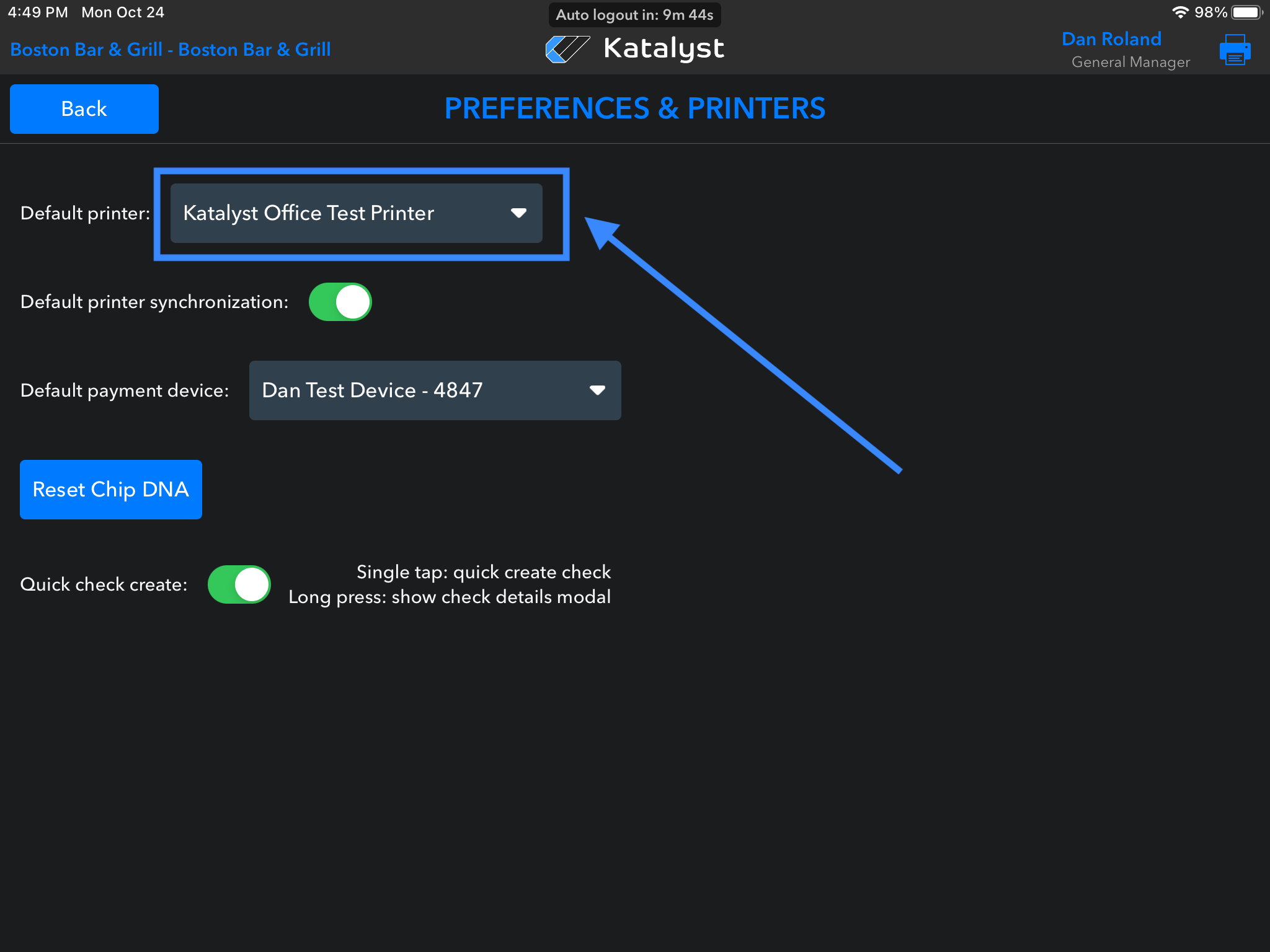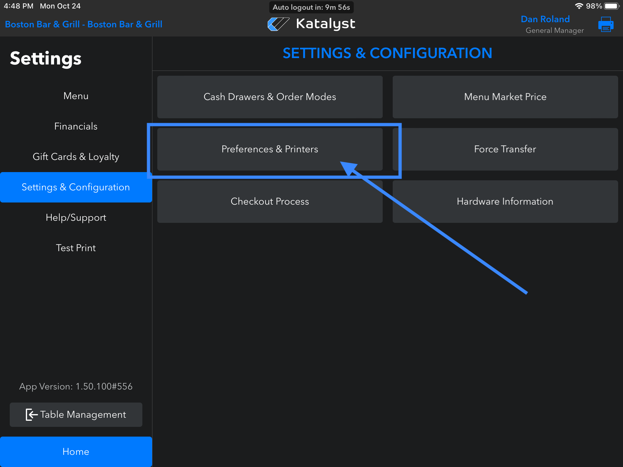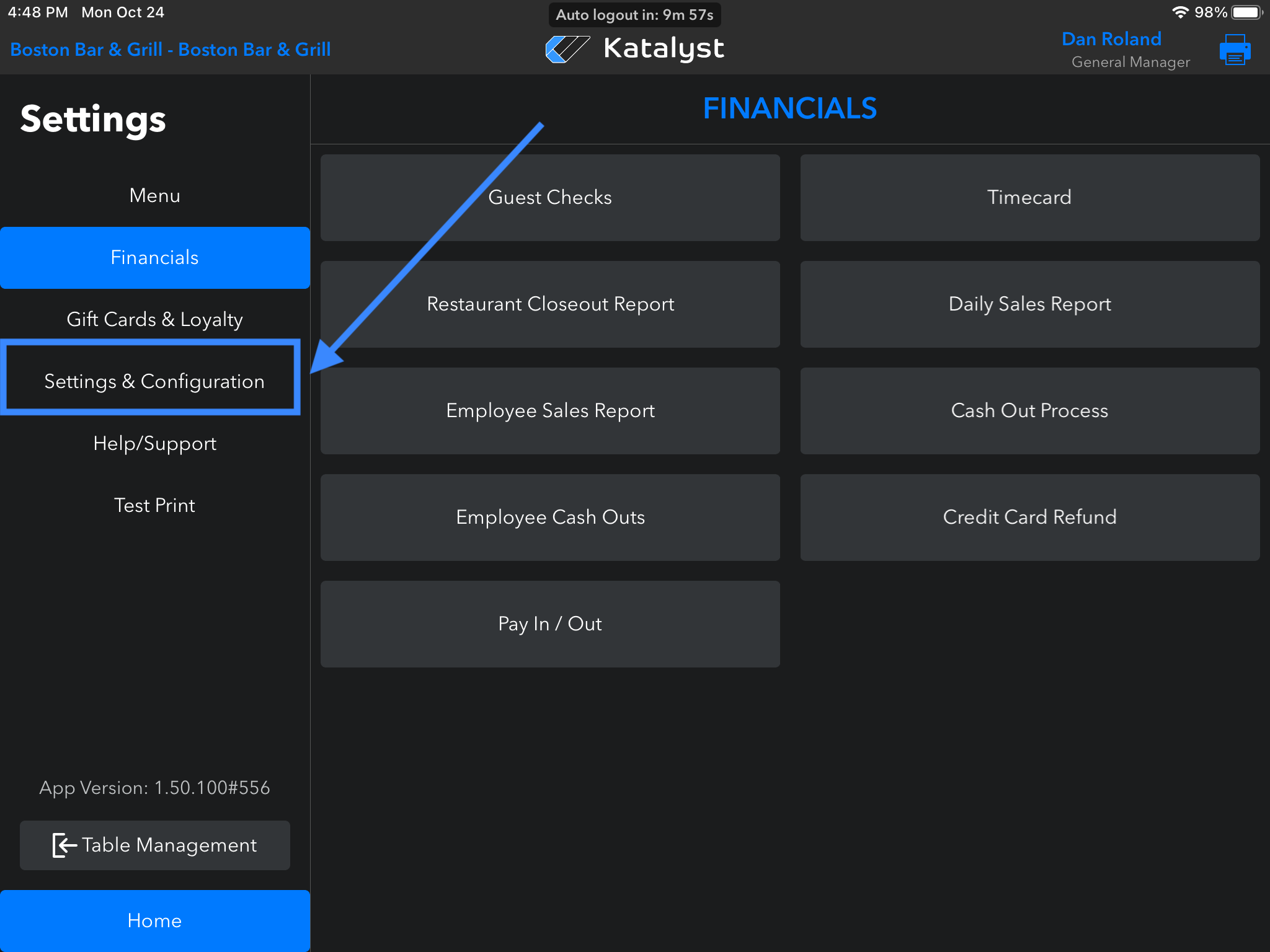 In the iPad settings, use the settings menu on the left to scroll down until you find the Katalyst POS app. After clicking into the app, check to make sure the Bluetooth setting is toggled green.
