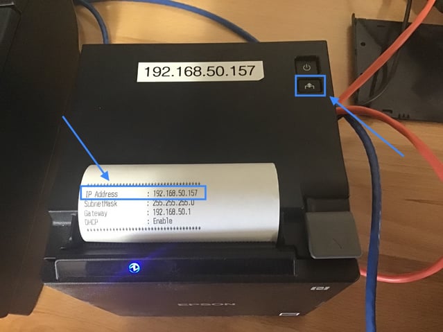 - Turn Off/On the printer; check that the IP address matches to the same printer in your web account. To get the IP address of the printer, turn off the printer. Wait 5 - 10 seconds. Then press and hold the feed button on the printer. Keep holding the feed button and turn back on the printer. Keep holding the feed button. A first slip will print out. After the first slip prints, press the feed button again and a second slip will print out that contains the IP Address. See below screen shot for verification of what the second IP address slip will look like