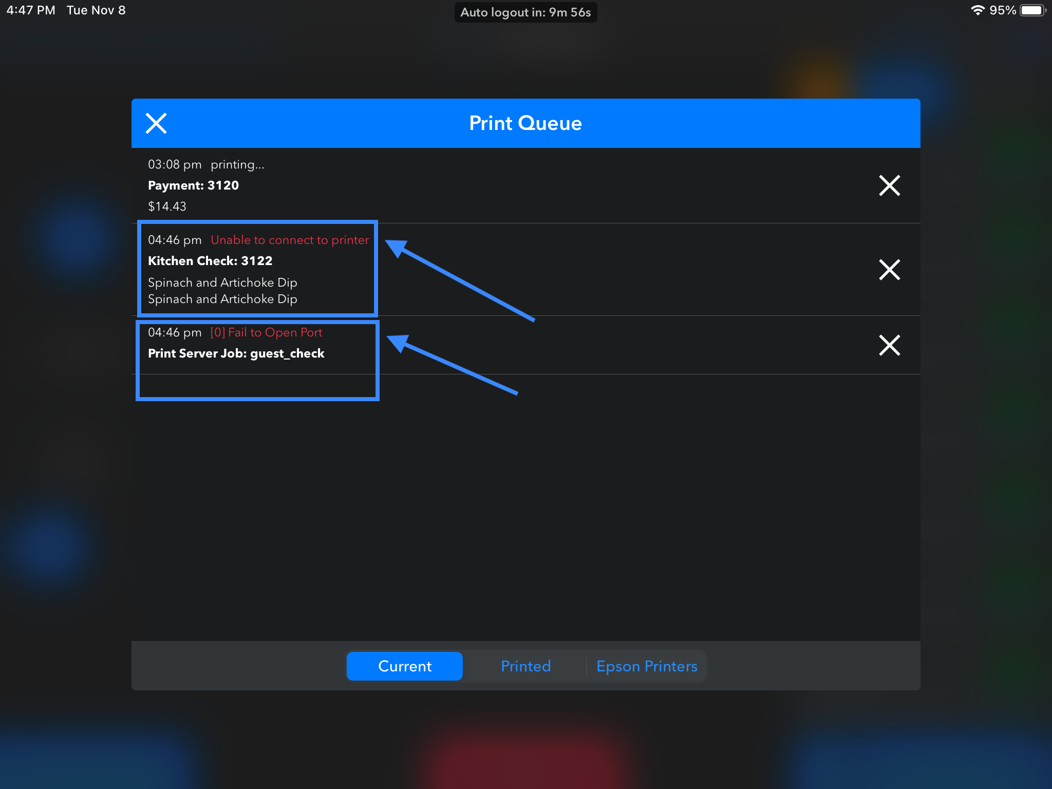 - Check the printer icon in the top right of the app; what error is it saying? If it says ‘Fail to Open Port’ it likely is a network or wiring issue
