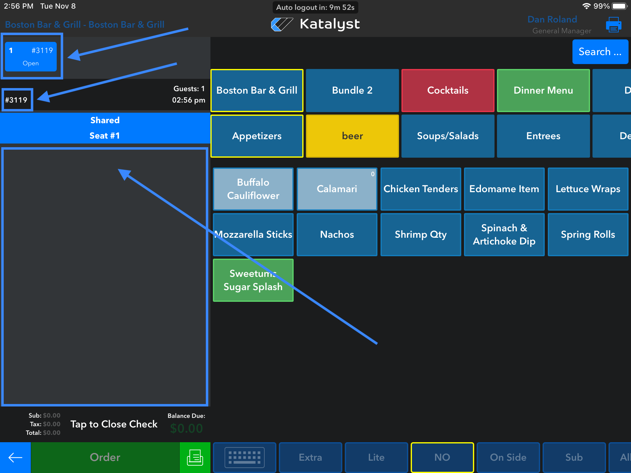 Once you are in the active check, you will see at the top left that the check is open and this is where you can find the check number. Below this information will be where any items that have been ordered by the table will be listed.