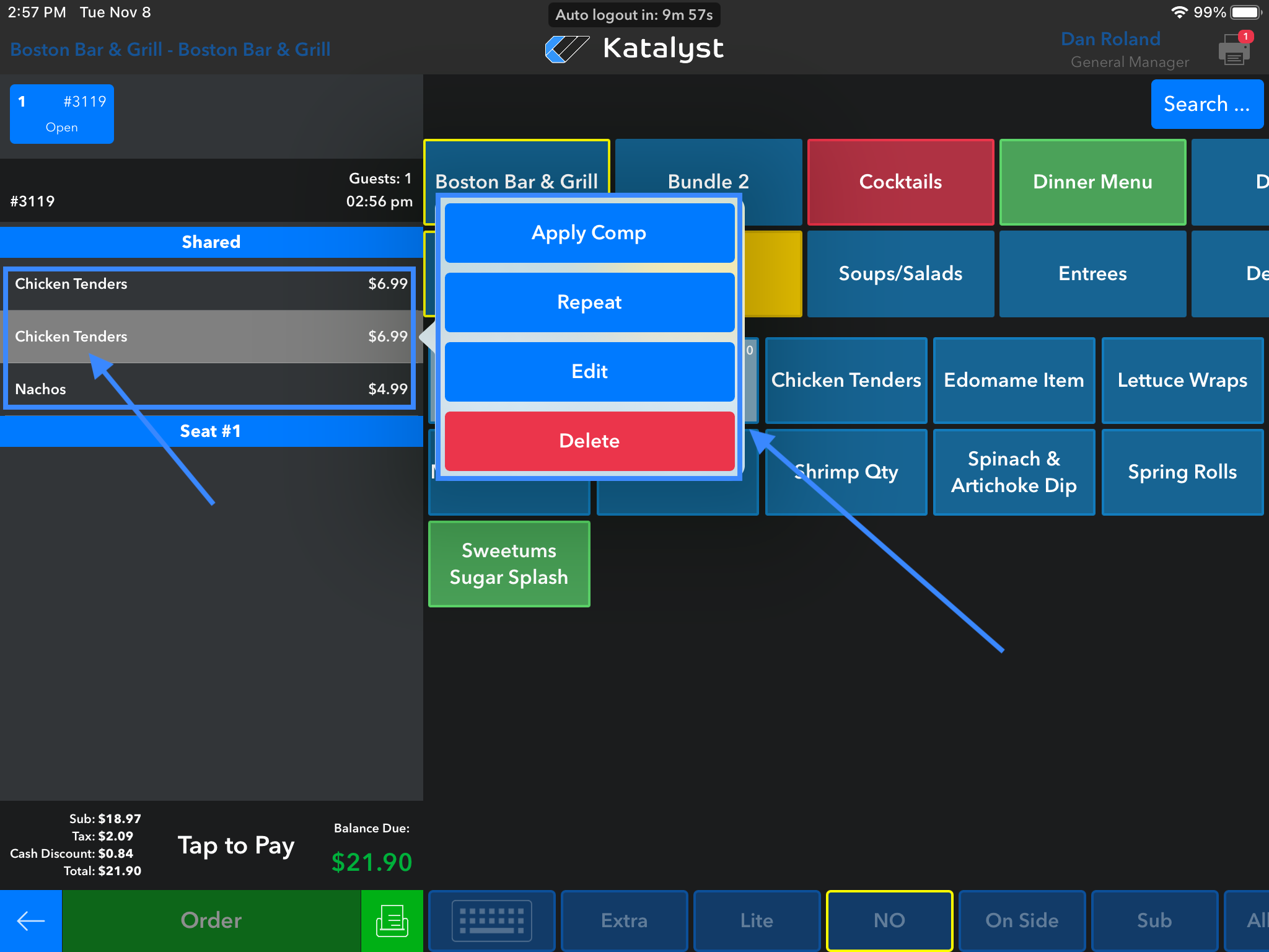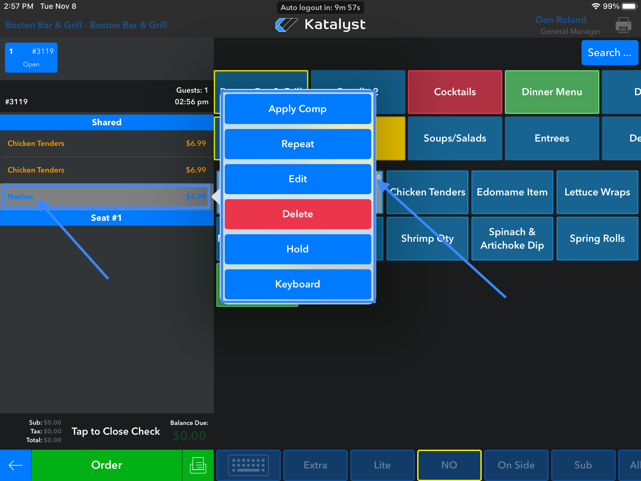 If the item is in white and has been ordered, we are able to click on it to allow for a pop-up to appear to the right. Ordered items will allow you to apply comp, repeat the item, or delete it. However, if the item has already been ordered and management has it set that deleted item has to be approved by management, the system will ask the server for a manager PIN before allowing the item to be deleted.