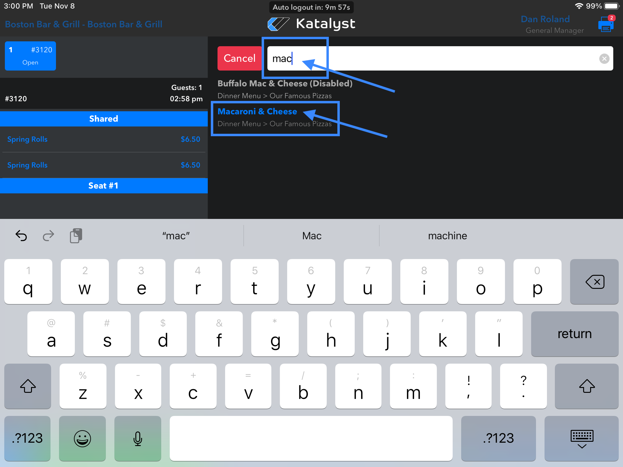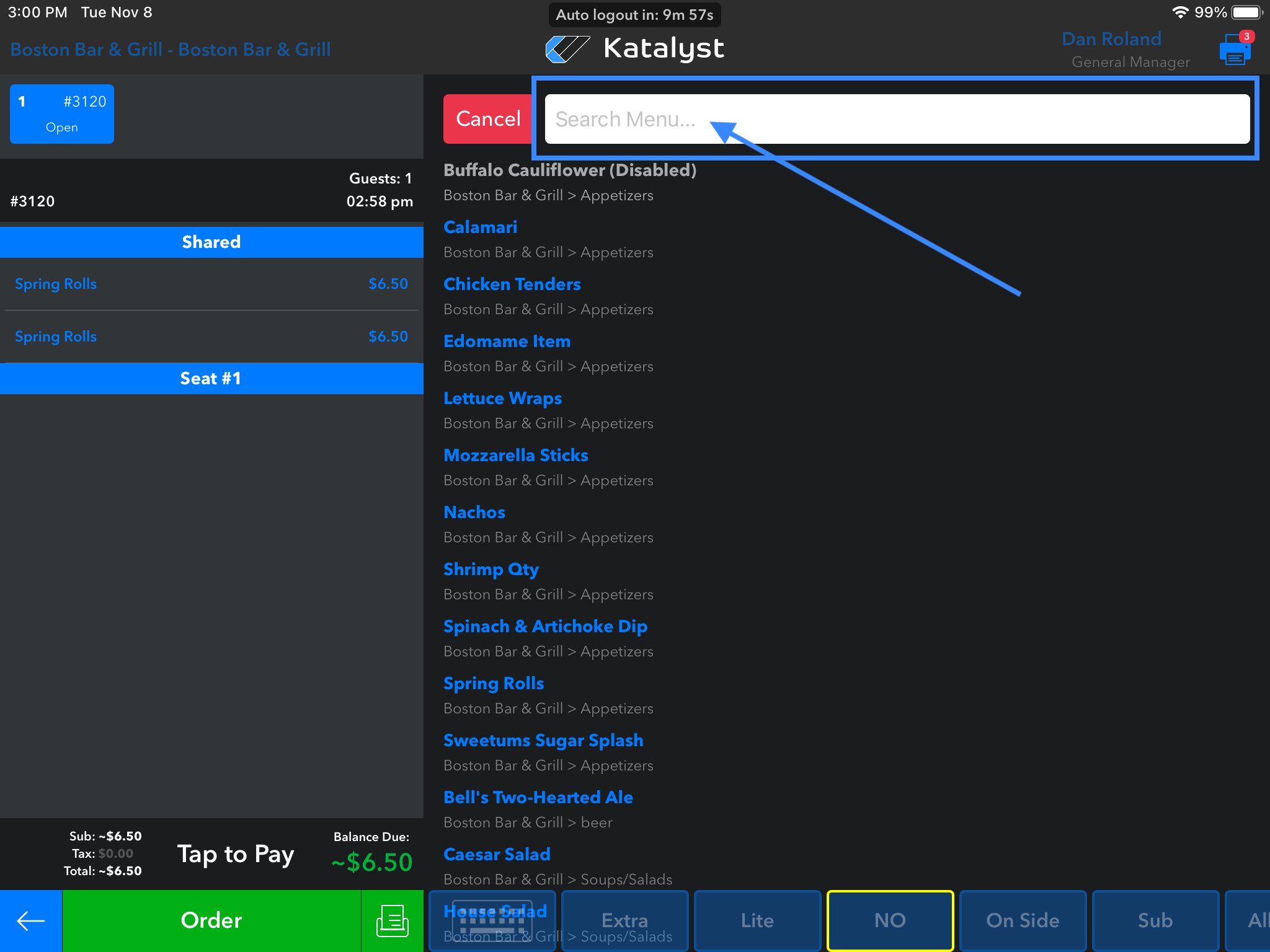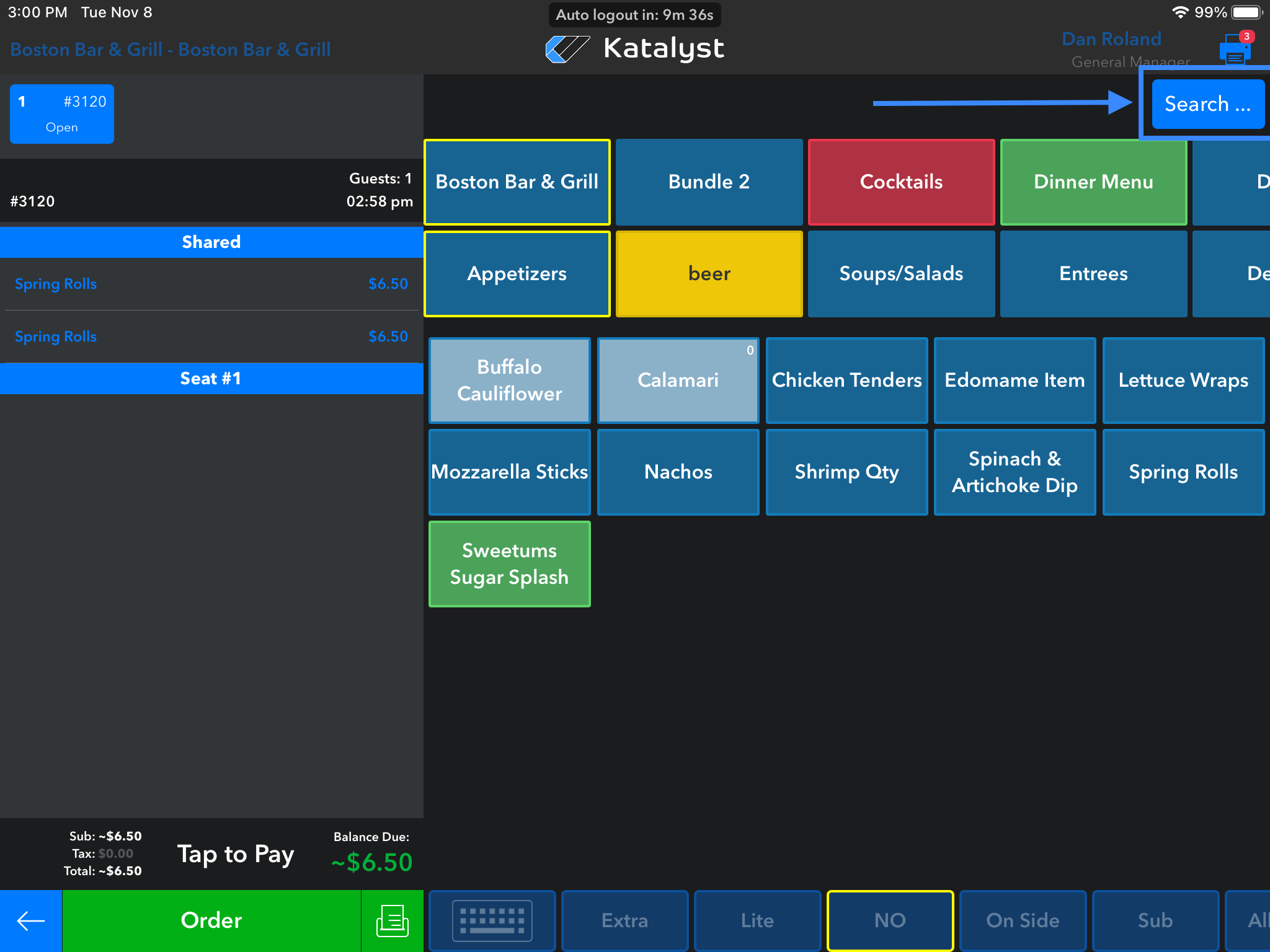 Pro-tip: While inside of a check, there is a search feature. The search feature located in the top right hand corner, is where the server can start typing any menu item to find it quickly. This feature is most helpful in new hire training and for merchants who may have extensive menus.