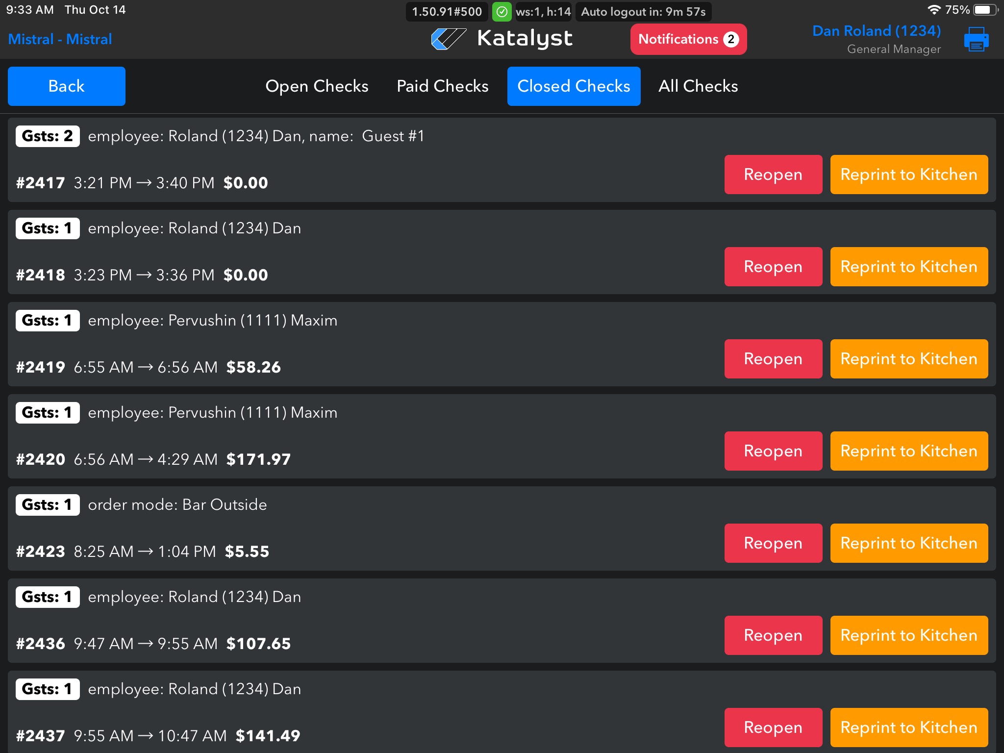If you need to reopen a check, you can do so by finding it in either closed or all checks, and clicking Reopen. Once you click reopen, you will be able to see the check via the ordering screen and it will be moved from Closed Checks to Paid Checks. From here, you can treat the check pretty much the same as if it hadn't been closed at all.