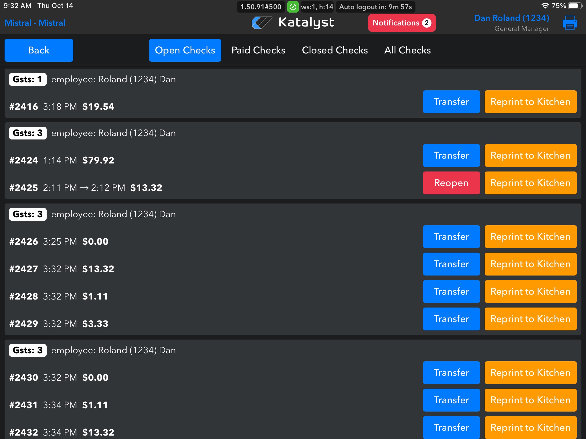 From Open Checks, you can see all checks that are currently open. From here you can transfer or reprint to the kitchen. A transfer will only be an option if the check is open.