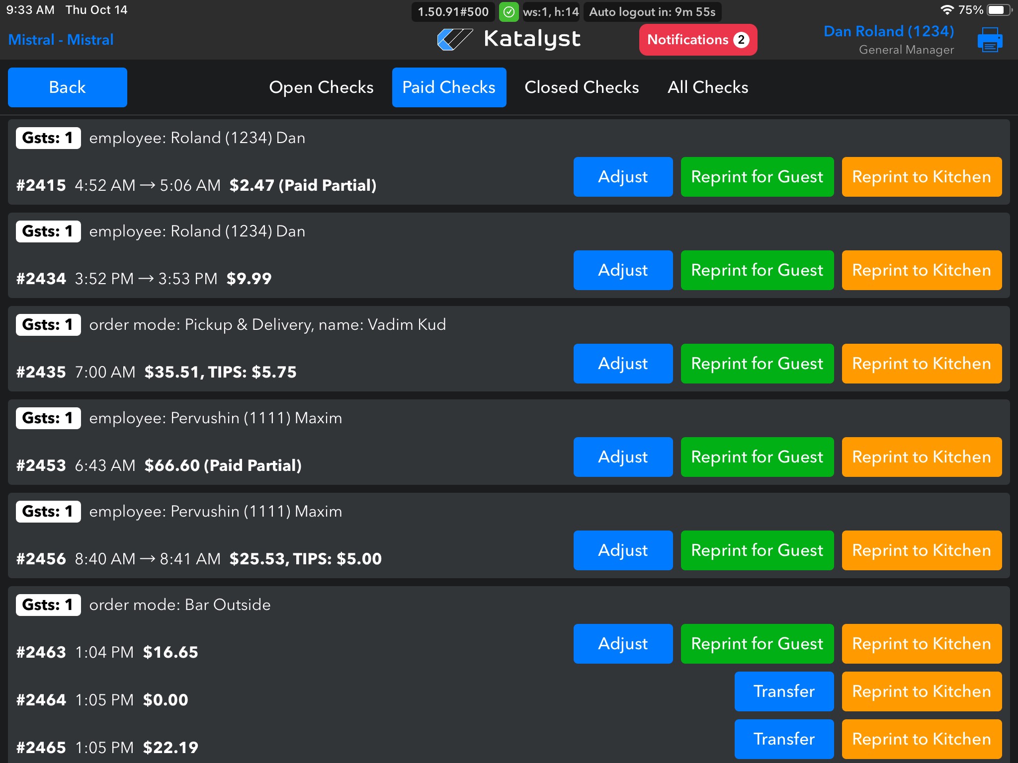 If the check is Paid but not closed, it will appear under Paid Checks. From here, you are able to Adjust, Reprint for Guests, and Reprint to Kitchen.