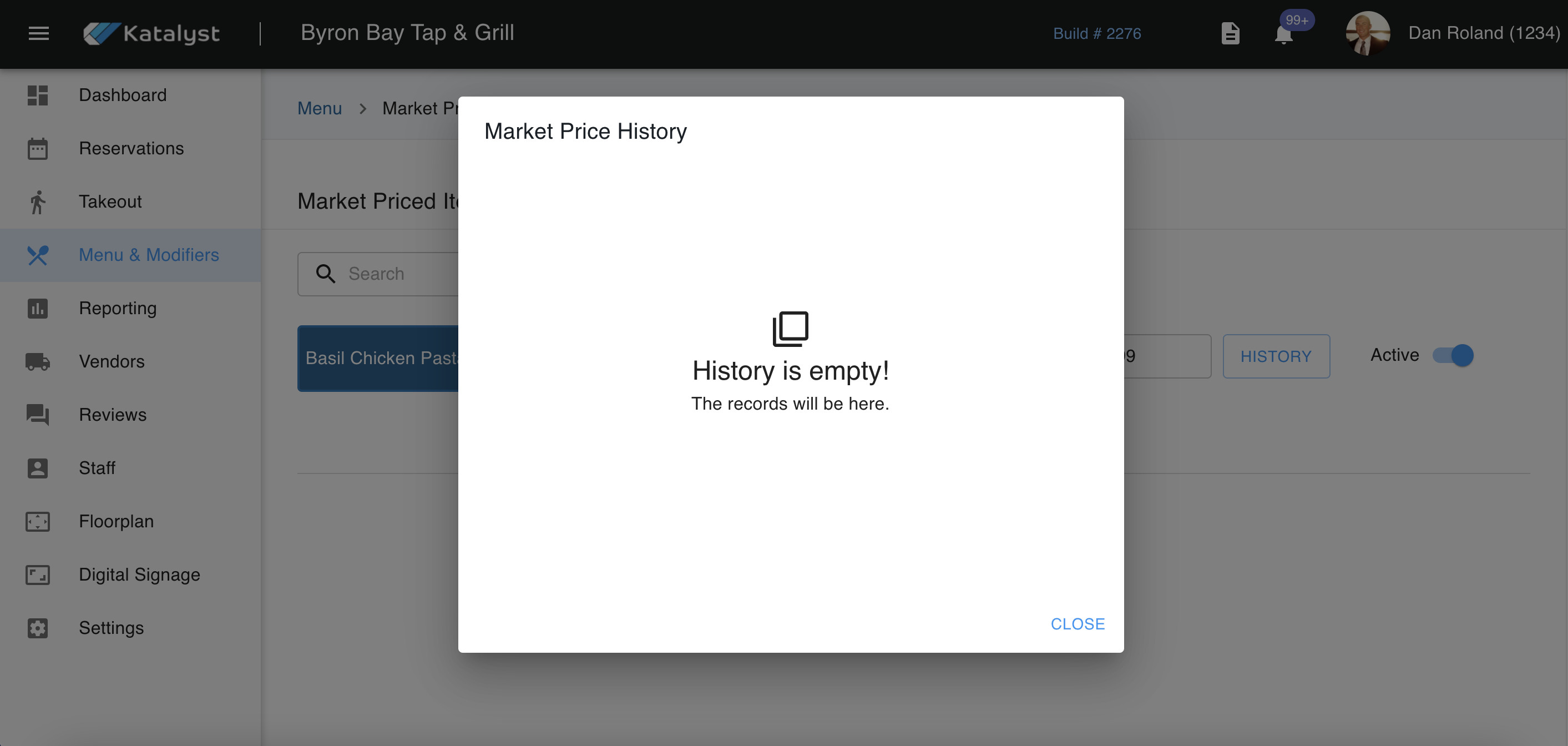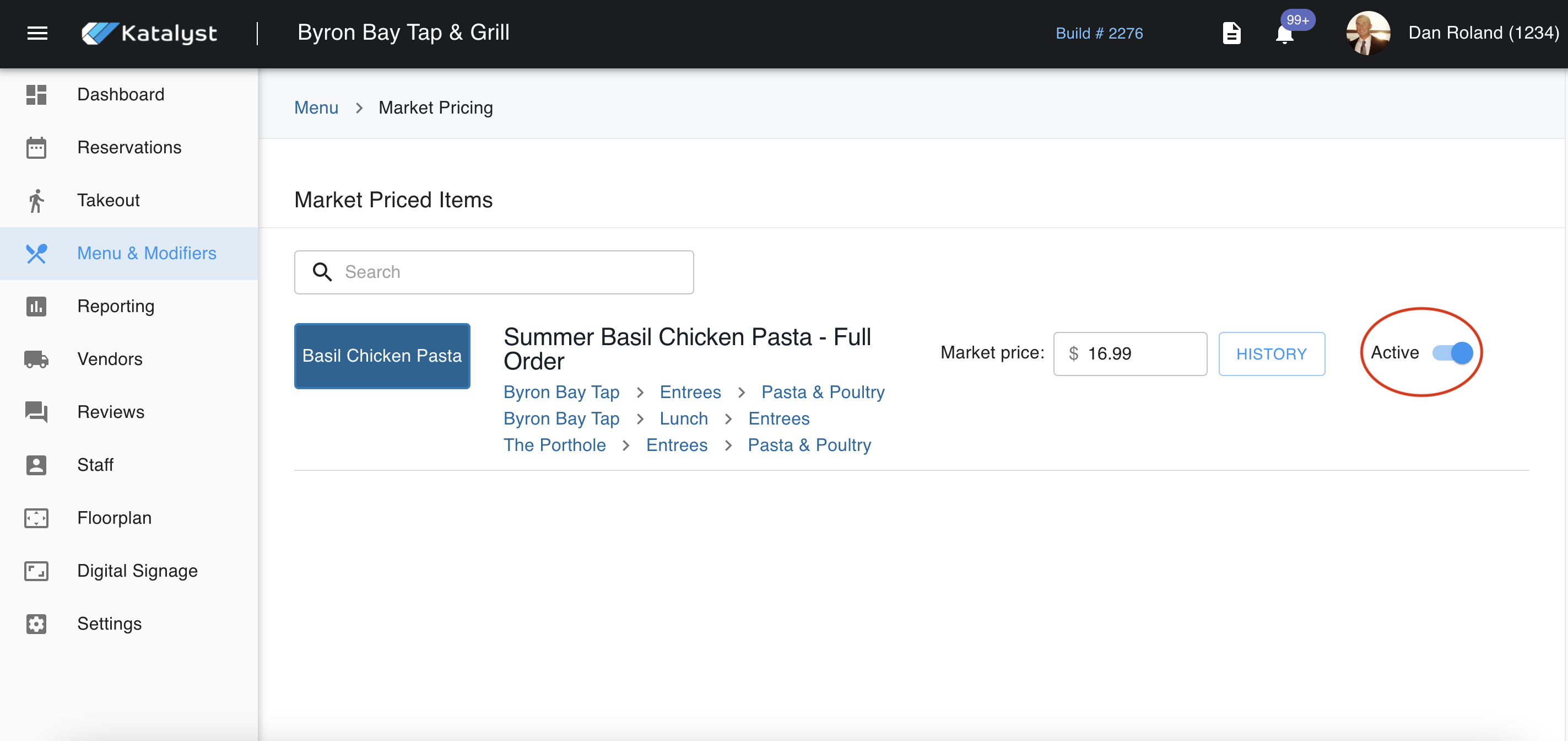Market Pricing is where you're able to price products based on the forces of supply and demand. Should you have a long list of items that are based on market pricing, you may want to use the search bar to quickly reference the item that needs to be edited. Once you have found the item, you will see the name of the product. In this case, we are looking at Basil Chicken Pasta.