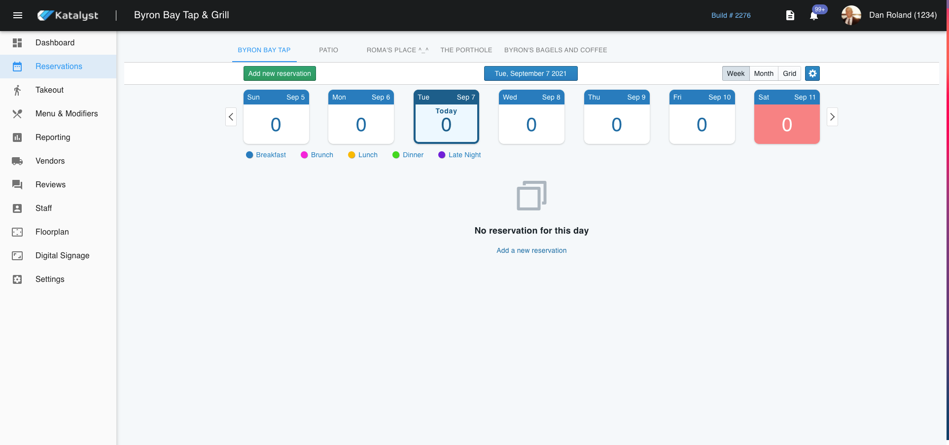 Here, you can see your reservations. You can select revenue centers along the top tab. Each revenue center will give the option for you to add a new reservation, as well as select how you would like to view the upcoming reservations.