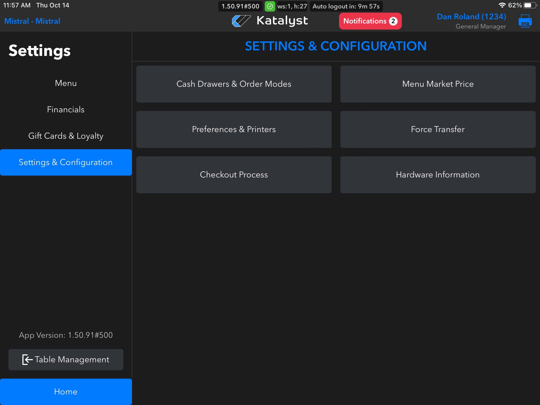 From Settings & Configuration, you're able to look at Cash Drawers, Order Modes, Menu Market Price, Preference and Printers, the Checkout Process, and Hardware Information.