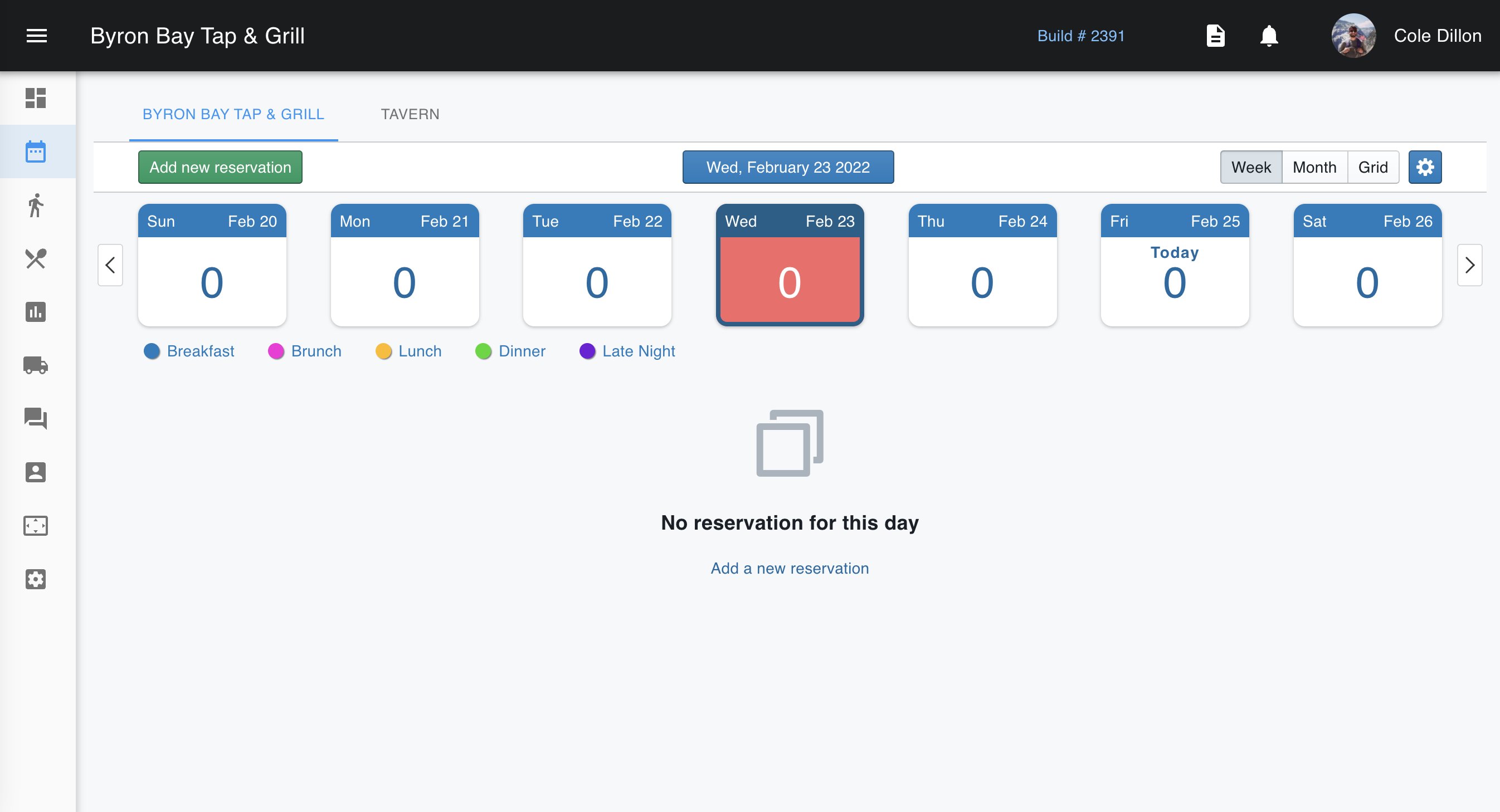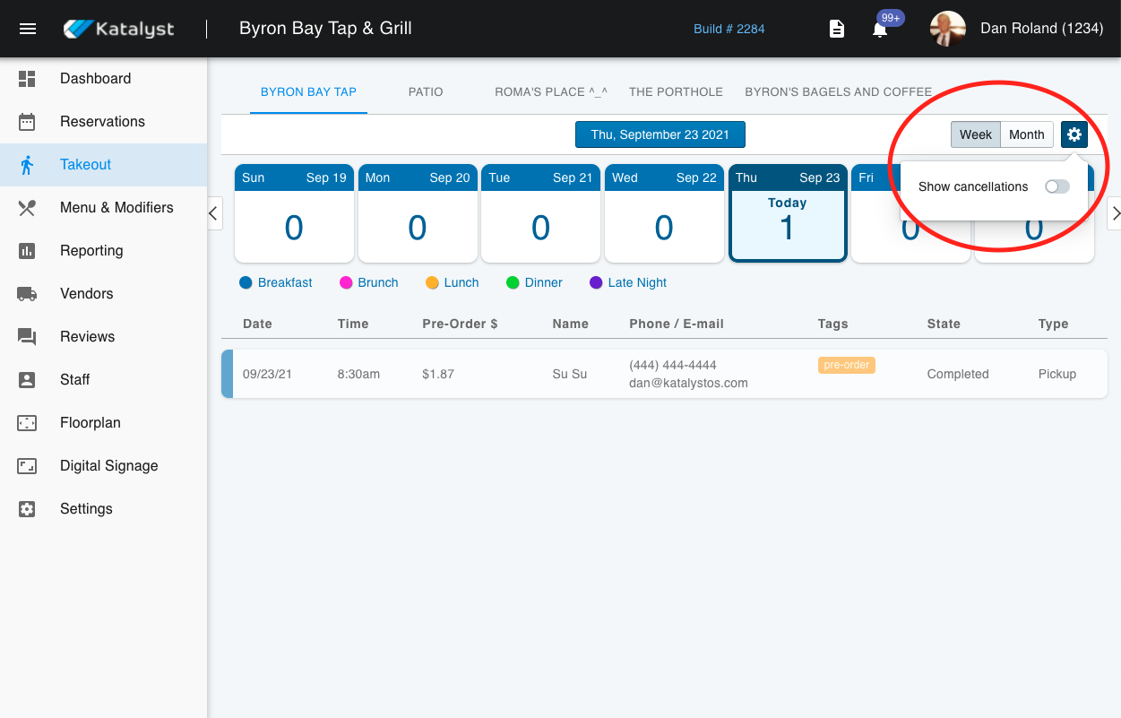 Take out will give you the same selections as the reservations tab. The main differences are it will not allow the merchant to add a take-out order from here and it will not allow the merchant to show the calendar in grid view. You can still use the settings gear to toggle on/off cancelation.