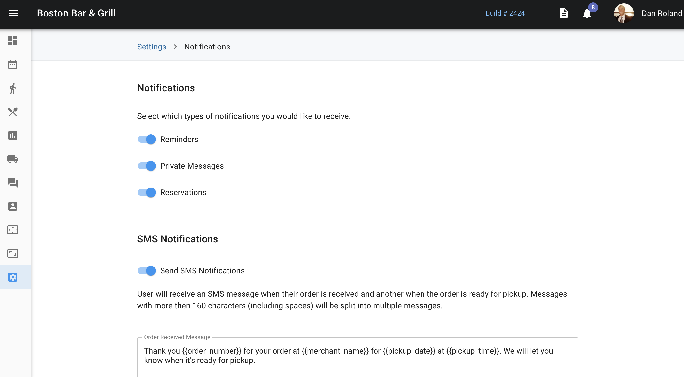 The Notifications Center allows you to turn on/off notifications for reminders, private messages, and reservations. These are for the restaurant owner, managers, and internal staff only - not for customers.