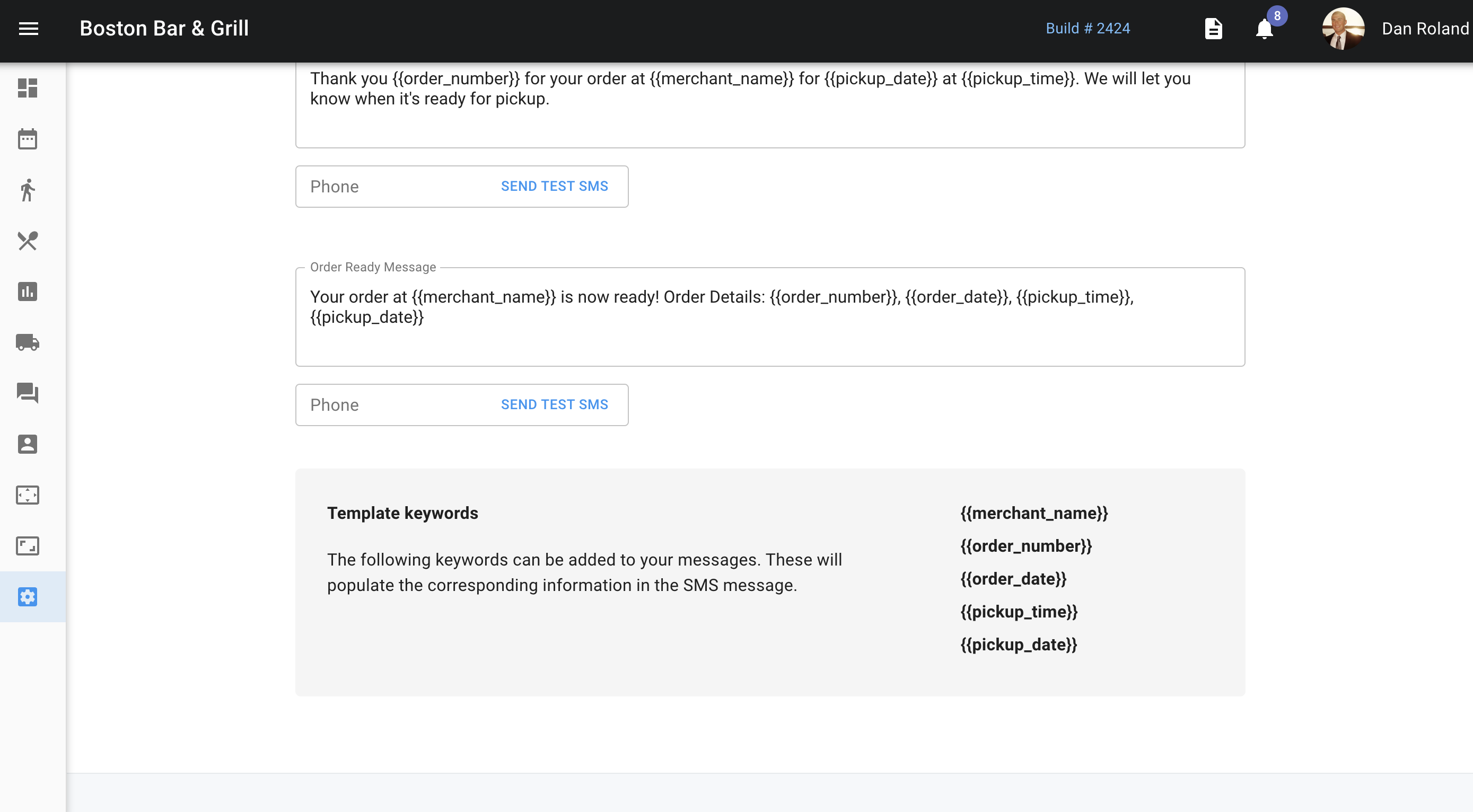 Below those settings is where we can find the SMS settings for pick-up orders that allow you to customize the messages and test the messages.