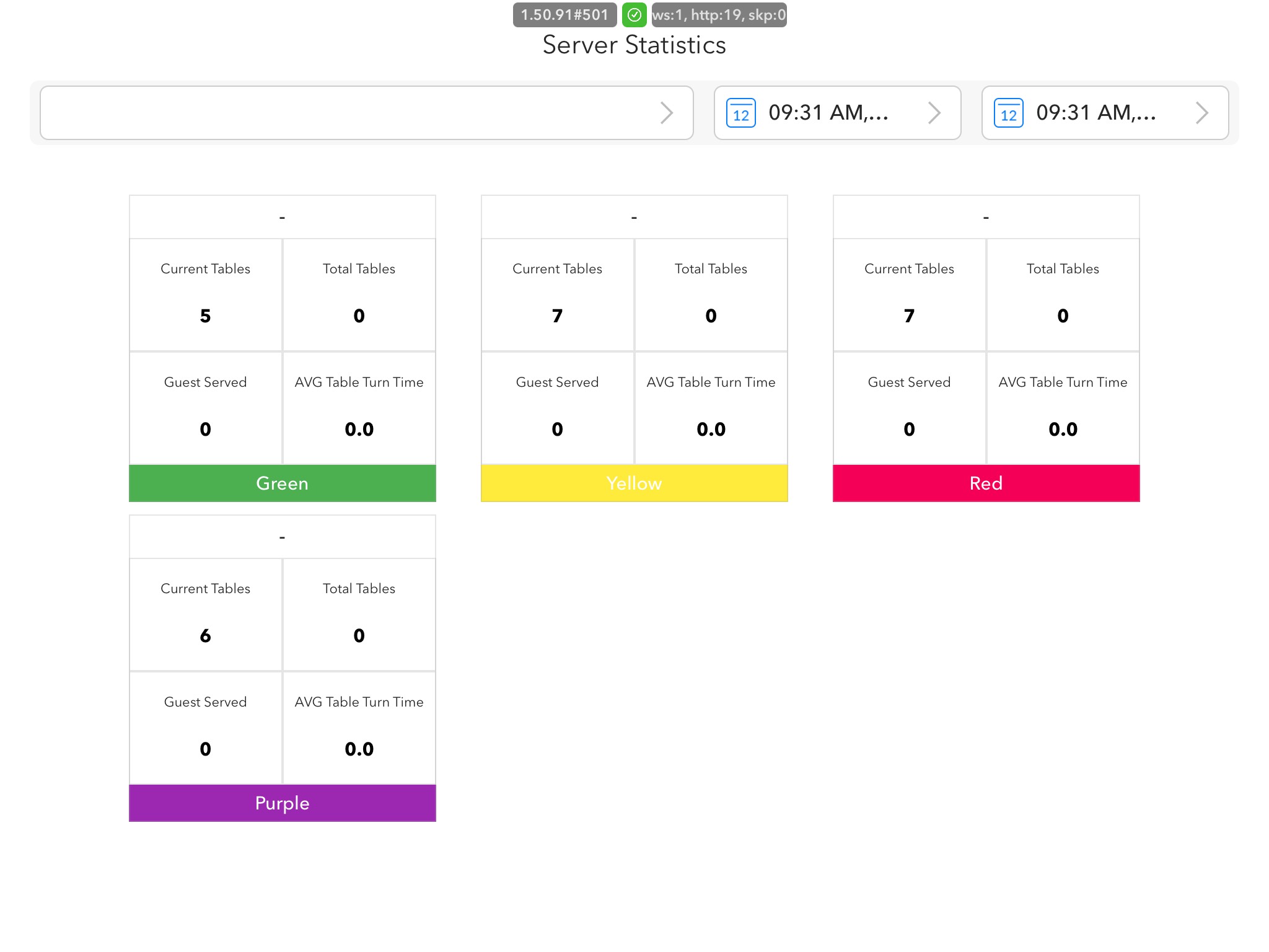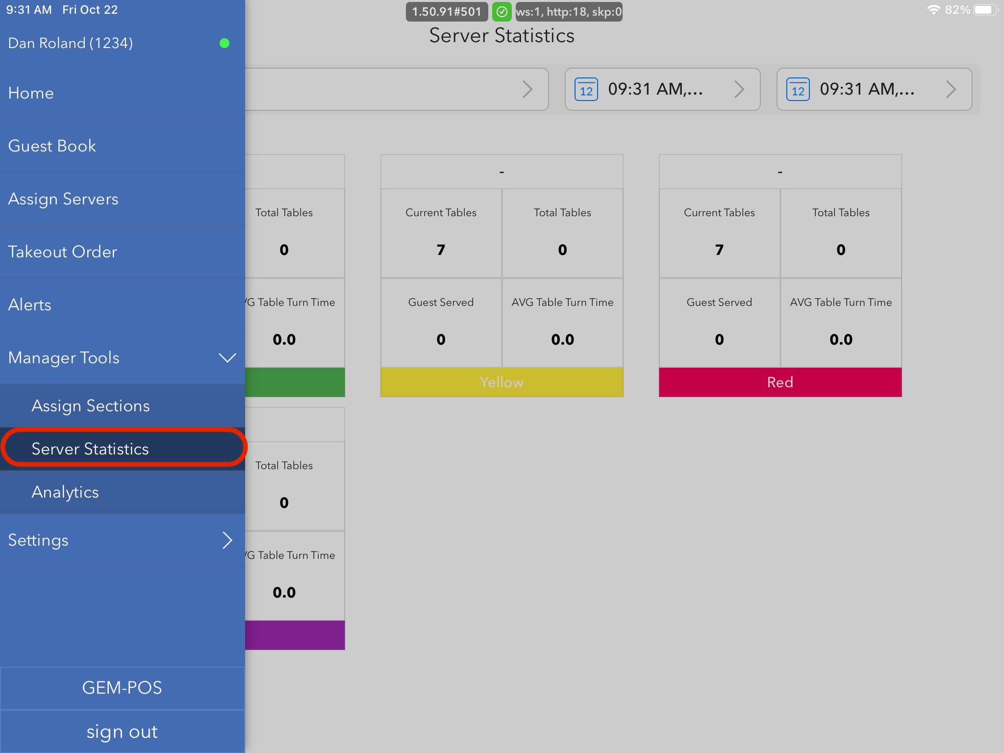 This screen will display the server who was assigned to a specific section, how many tables they currently have (if checking for real-time covers, total tables, guest served (this is per head), and the average time the table took to turn over.