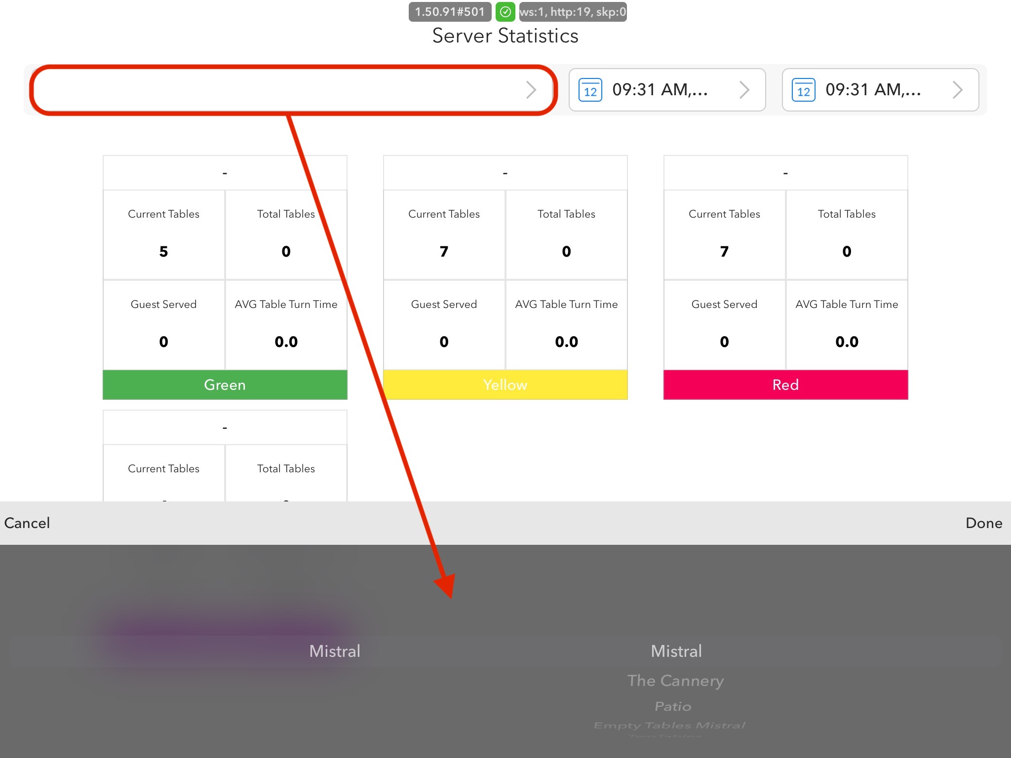You're also able to switch between revenue centers to see how your staff is doing in different areas. To do so, you would just use the drop-down menu that allows access to a scroll feature at the bottom of the screen. Once you're on the revenue center that you would like to look at, you will press done.