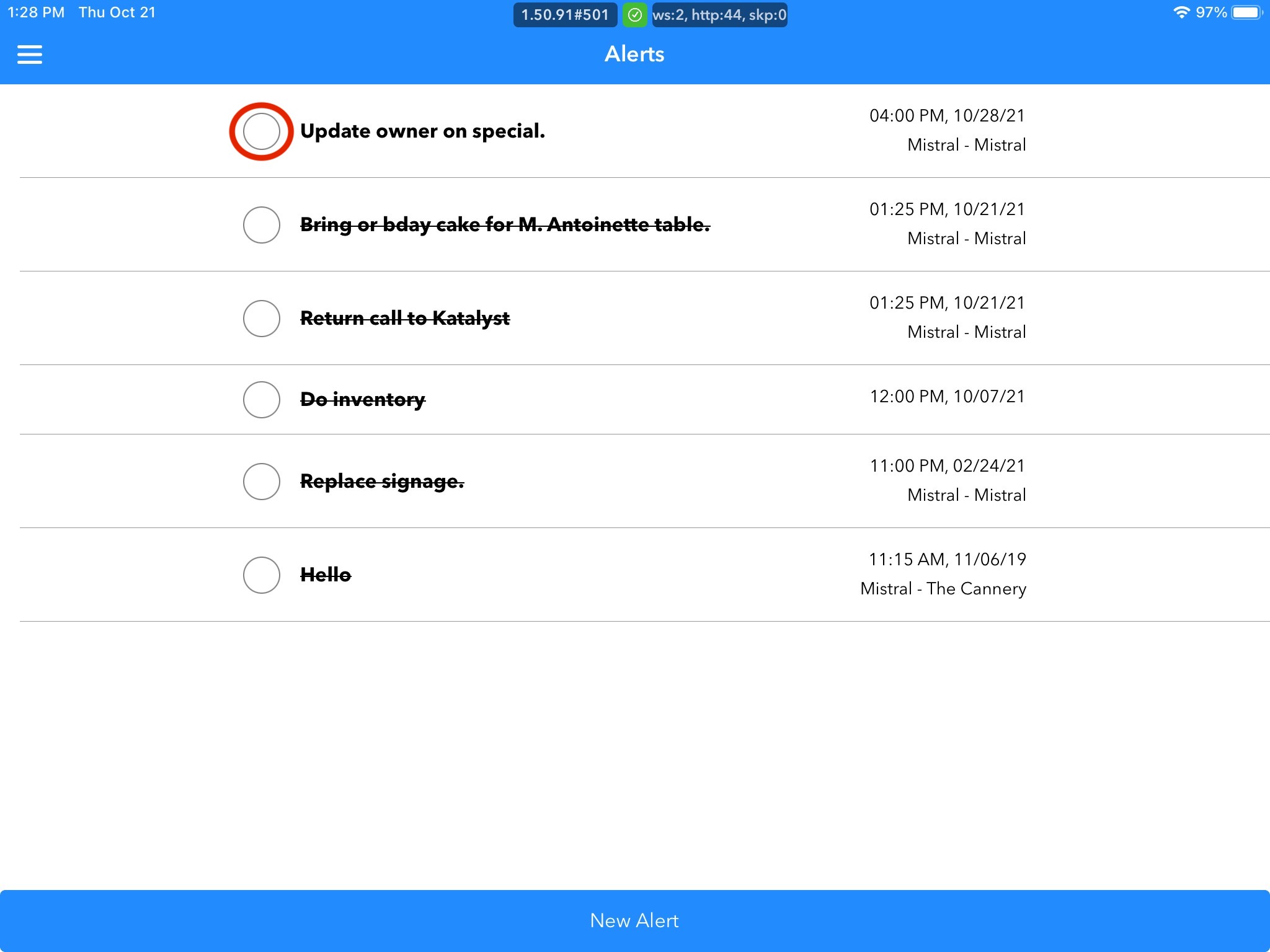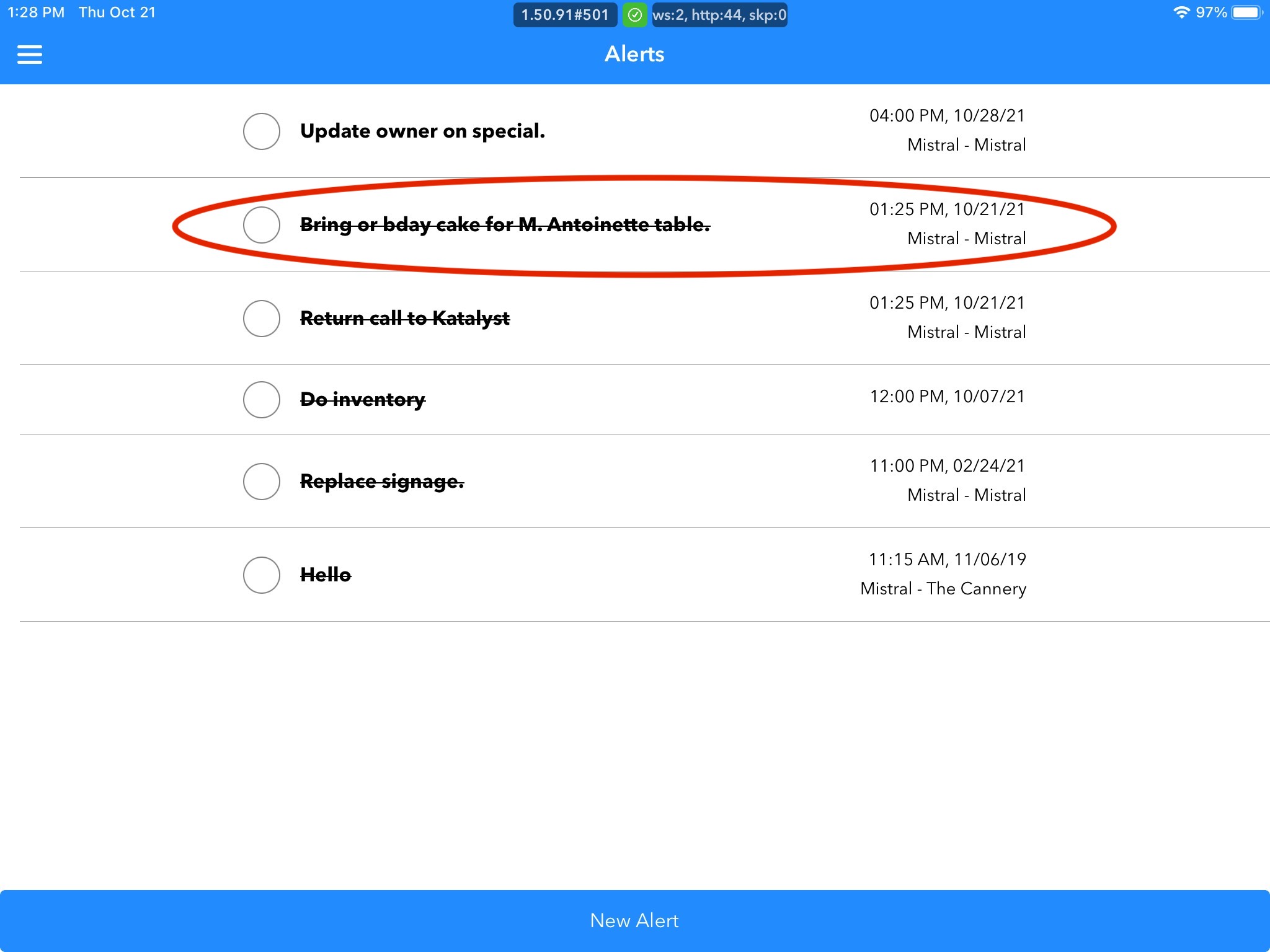 If the alert has expired, or not been completed within its allotted time frame, it will not be removed from the list. Instead, it will be crossed out, but still accessible to complete or change the due date/time.