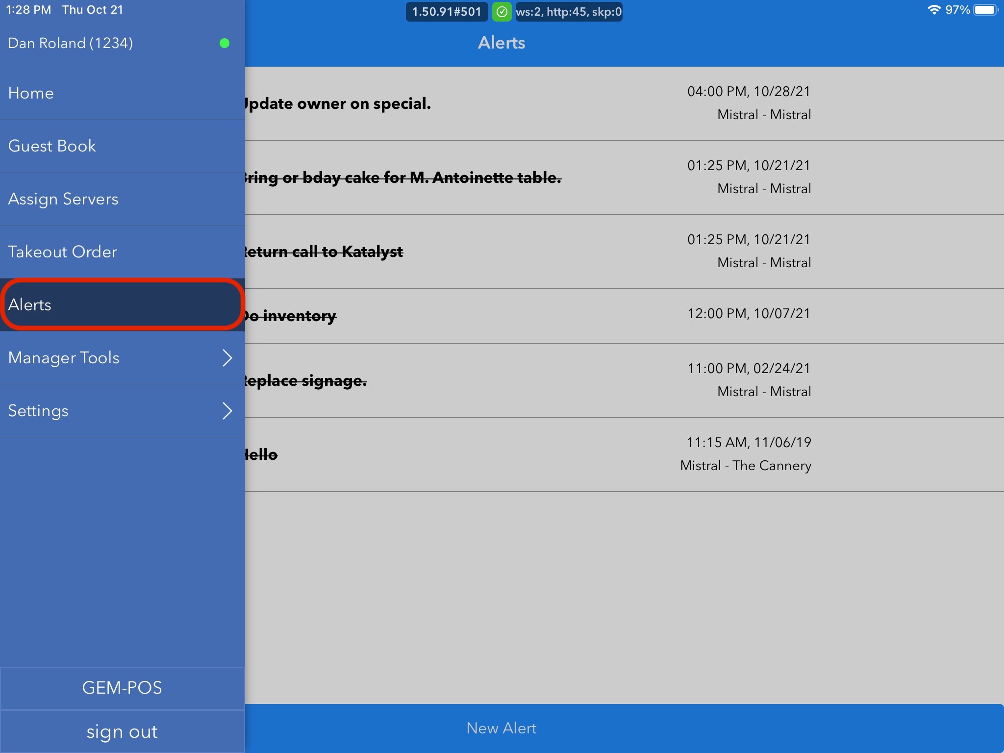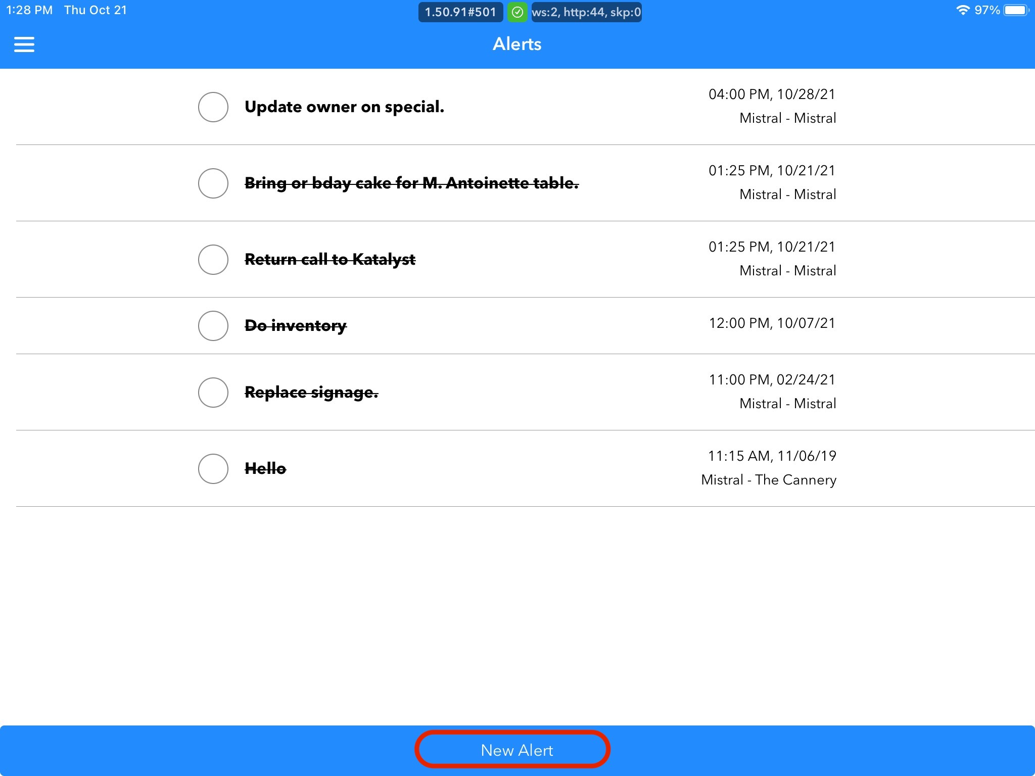 Alerts allow you to set reminders for yourself using your Katalyst POS system. You can use it to remind yourself about tasks, customer requests, or anything else that comes up in your day-to-day functions. You can choose from previously created alerts or create new alerts located at the bottom of the screen.