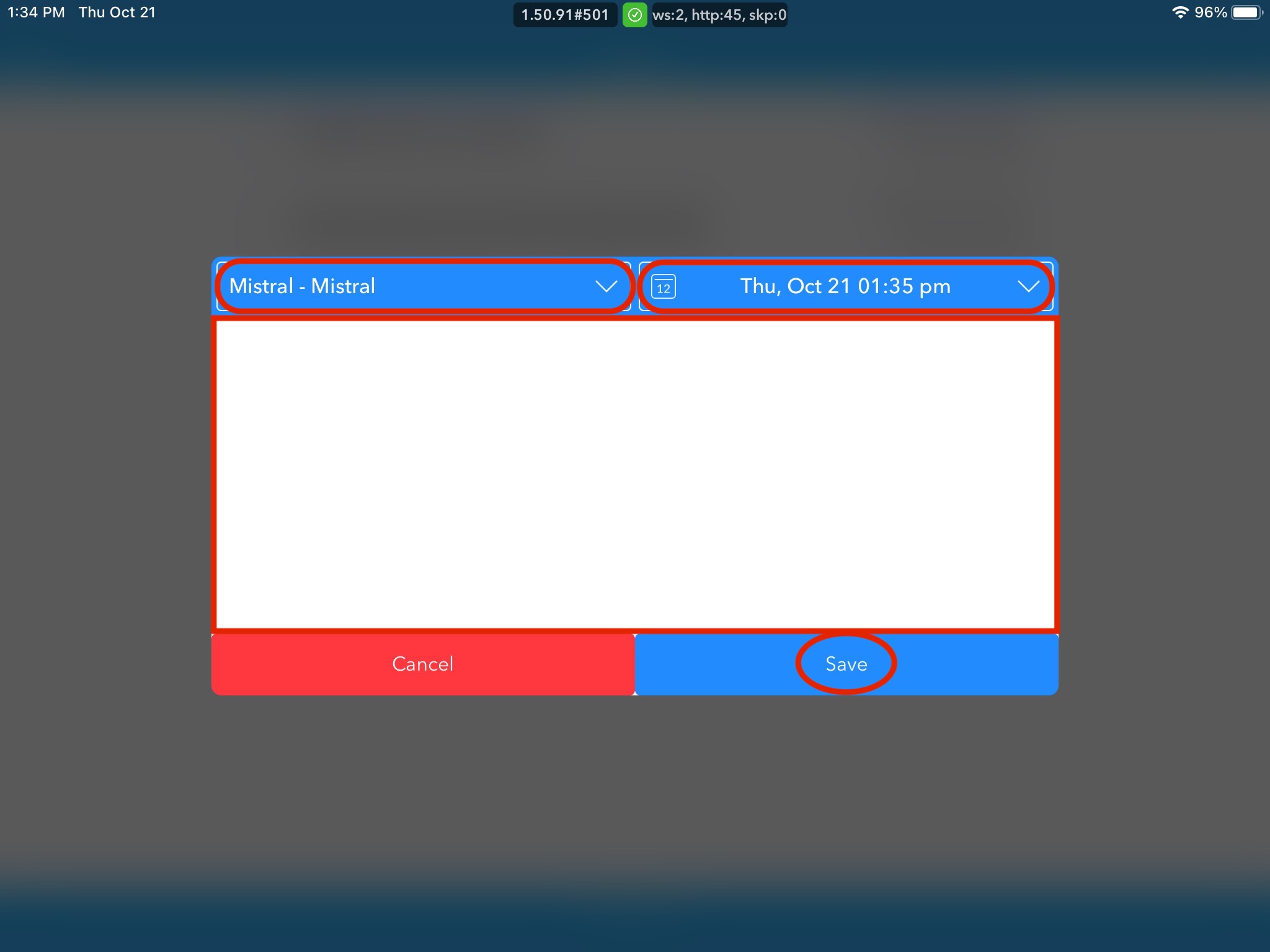 Once this is clicked, a popup screen will appear where you're able to choose the revenue center, date, and time. Clicking into the text box will allow you to enter what note you want. You must save the note for it to become active.