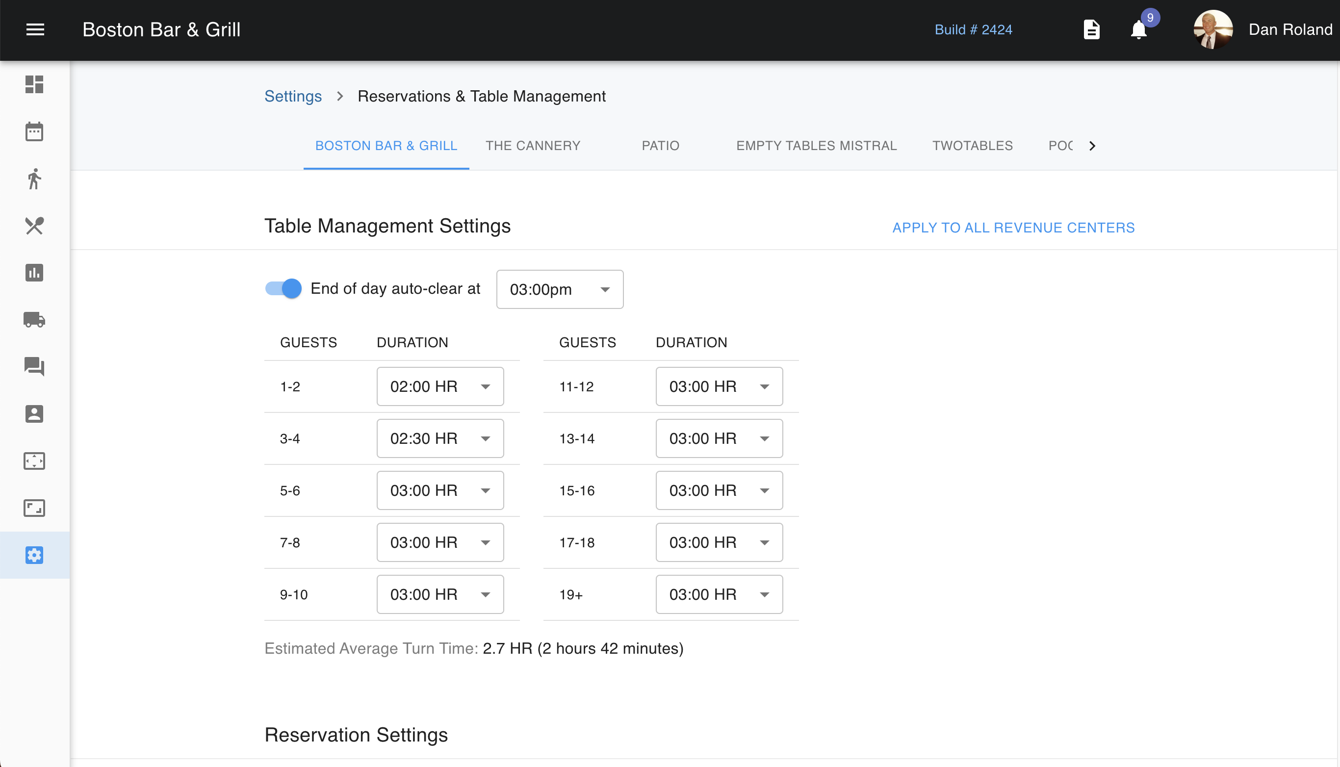 Below this is the estimated table turn times depending on the number of guests. This will affect the customer if they are attempting to make a reservation online and there are no tables available for their group time/size. The system will suggest another time based on availability.