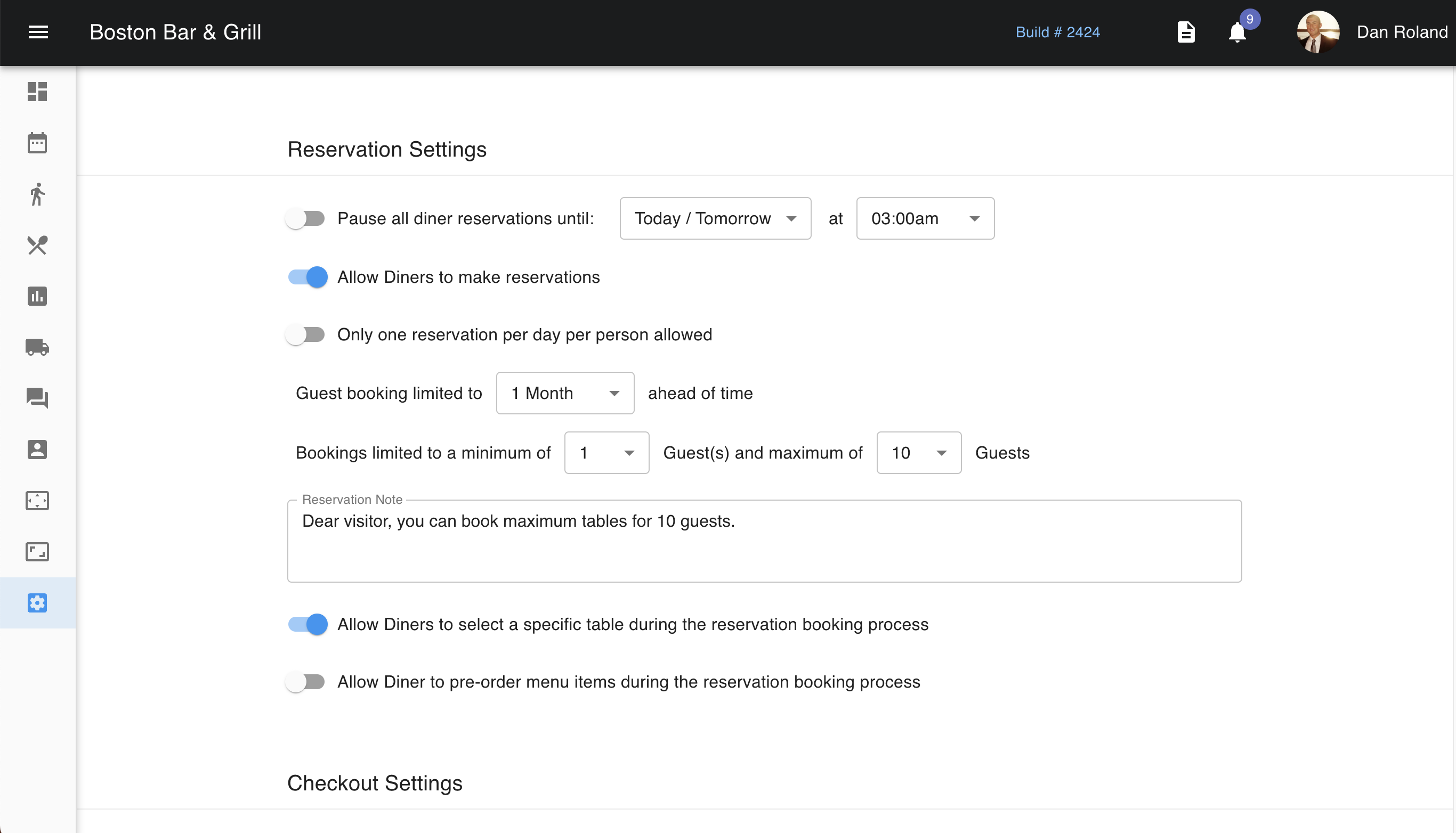 Below are the Reservation Settings where you're able to control when reservations can be made. The first toggle allows you to temporarily pause diner reservations either on a specific day and time or indefinitely. You should be aware that if you use this toggle, it will need to be manually toggled off when you no longer need the reservations to be paused.