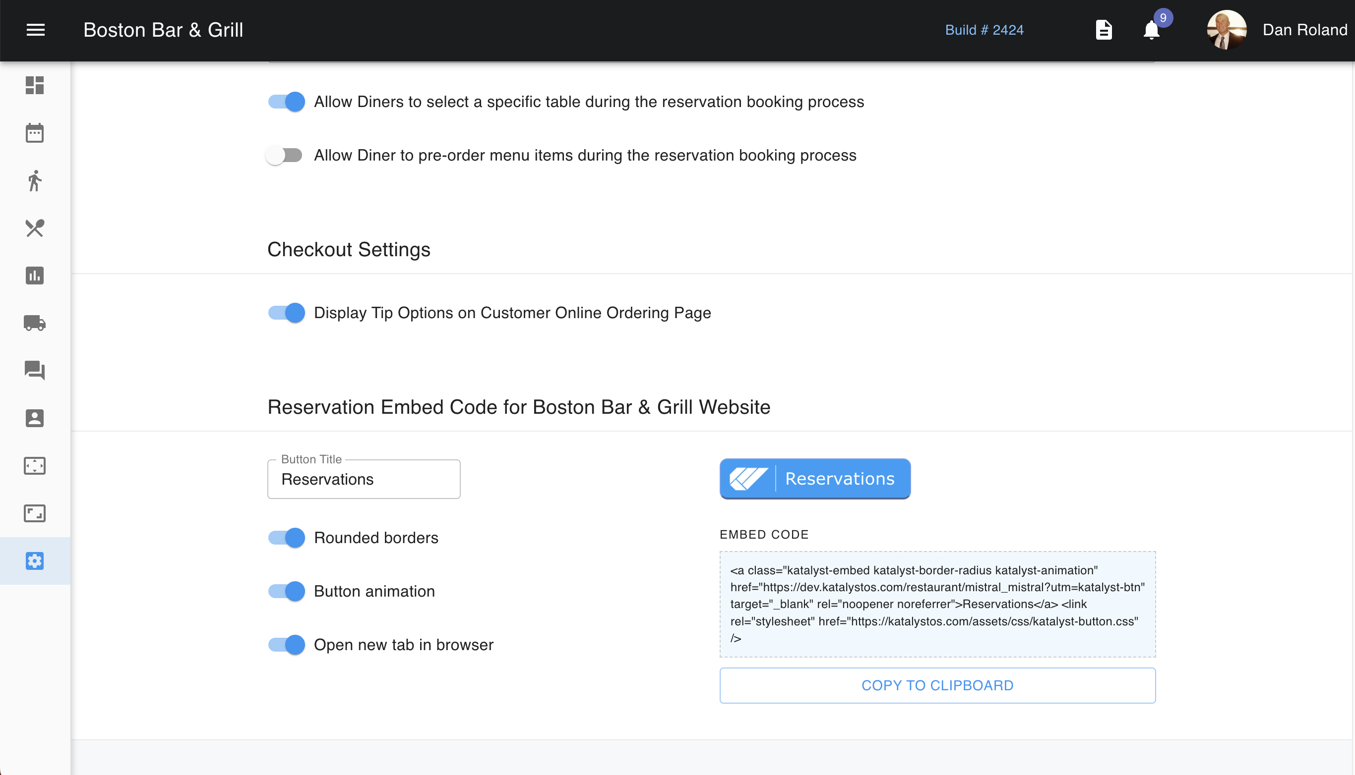 Scrolling further down, you're able to toggle on or off the ability of the customer to enter a tip when checking out from an online order. You can also find the code that must be embedded into your site to allow guests to make reservations and orders through Katalyst. You can indicate the title of the button that will display to the guest if it is rounded, or animated, and if it opens a new tab in the browser.
