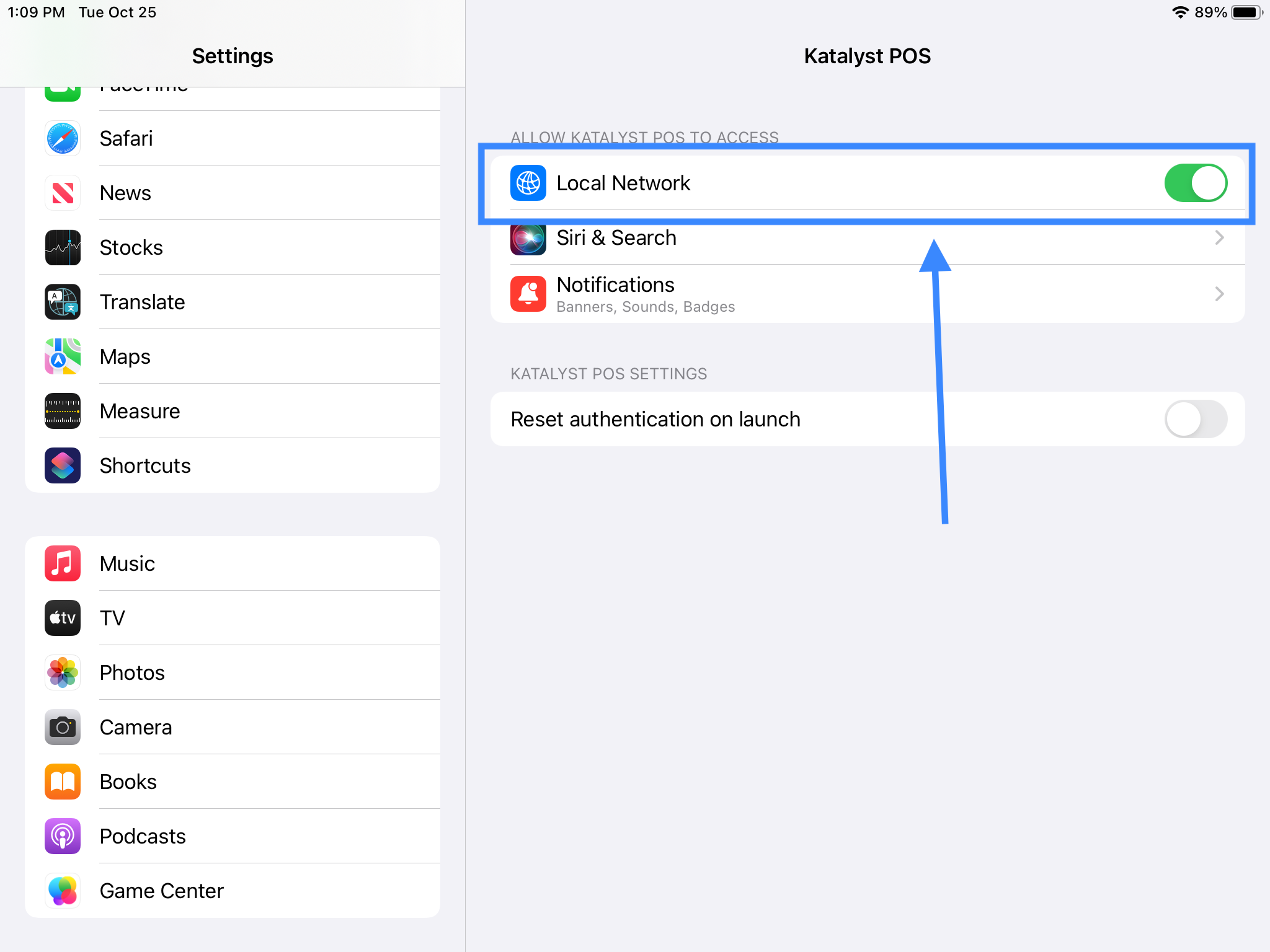 - In the iPad, go to the iPad settings and scroll down on the left. Click on Katalyst POS and make sure the Local Network toggle is green - uncheck and check again just to make sure the connection is actually established