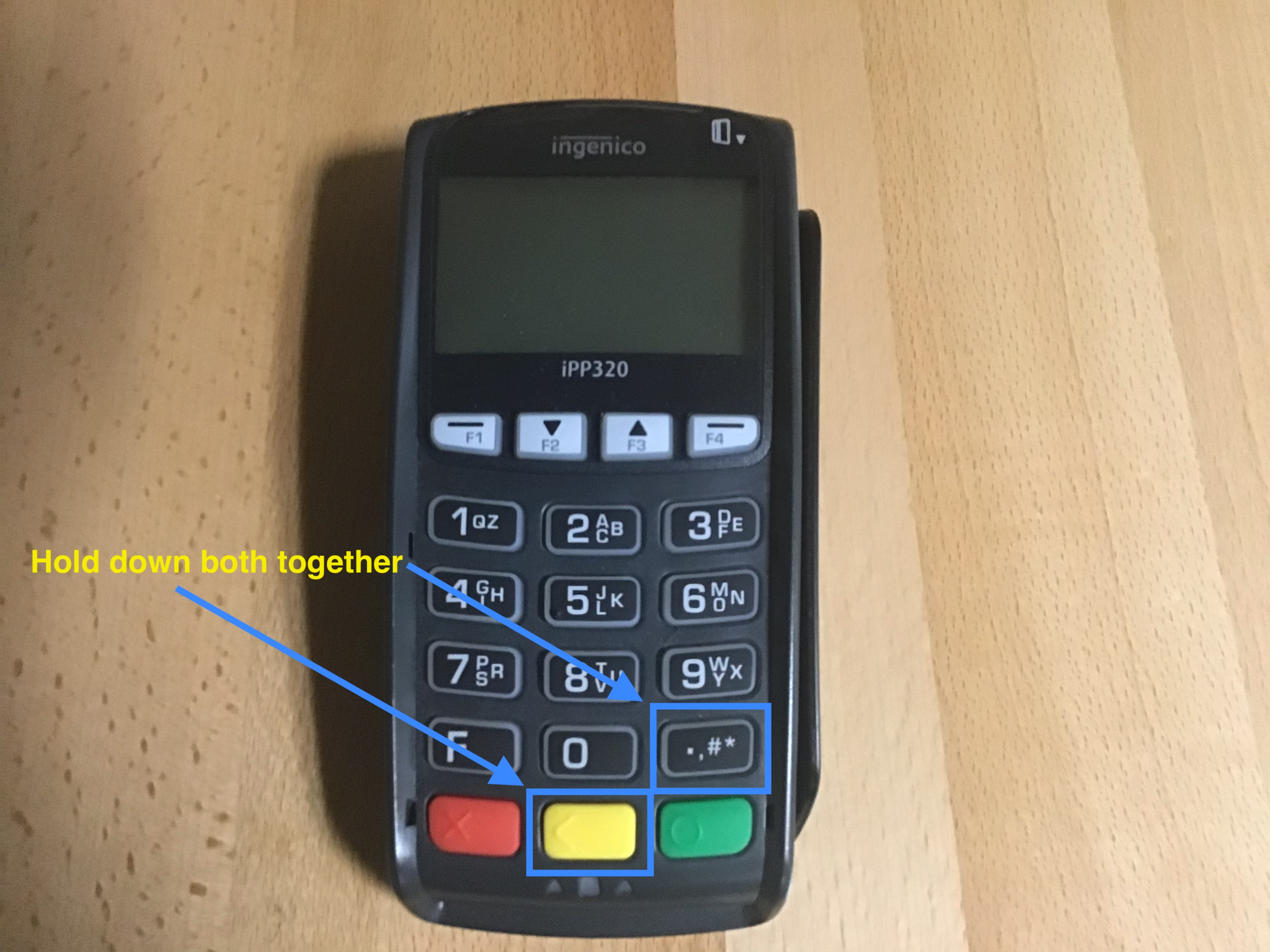 - Power cycle/restart the device; to do this hold down the Yellow button and ‘#’ button at the same time. The device will restart automatically. Try the payment again