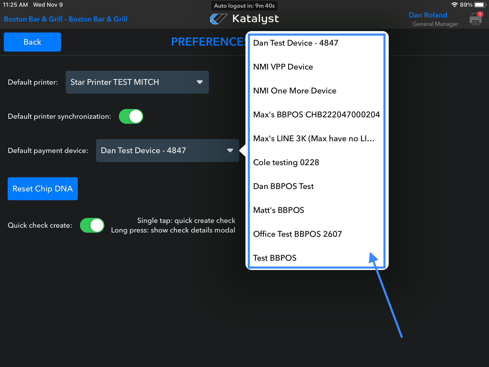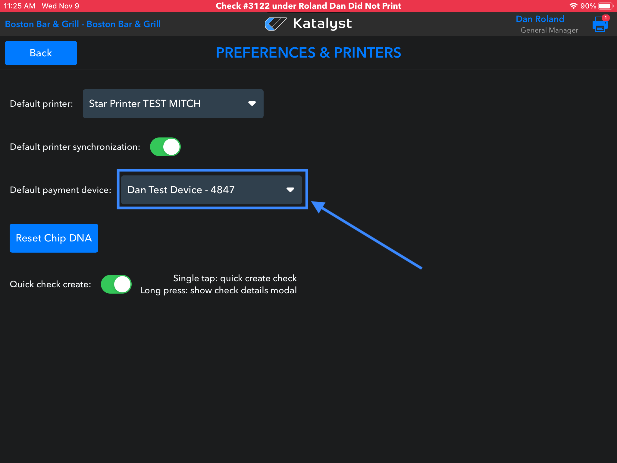 - On your iPad, go to Settings > Settings & Configuration > Preferences & Printers; make sure that the payment device is selected in the Default dropdown